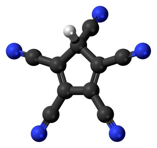 | Keywords: Pentacyanocyclopentadiene-3D-balls.png Ball-and-stick model of the pentacyanocyclopentadiene molecule a compound with five nitrile groups Colour code 505050 Carbon C black<br> F0F0F0 Hydrogen H white<br> 3C50FA Nitrogen N blue<br> 2011-01-27 own DS Visualizer Jynto talk Space-filling version cc-zero Nitriles Cyclopentadiene derivatives Images by Jynto |