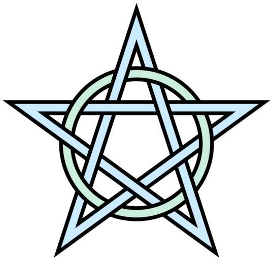 | Keywords: Pentagram-circle-interlaced.svg Ornamental interlaced pentagram and circle topologically equivalent to File Pentagonal-knot svg Self-made graphic based on abstract geometry a circle with radius 150 and a pentagram with its outer vertices 250 units from the center both stroked with an outer width of about 32 and an inner width half that So converted from a version of the following vector PostScript source code <pre> 306 396 translate/plr 250 dup 3 2 roll 72 mul 90 add dup 3 1 roll cos mul 3 1 roll sin mul def/A 0 0 150 0 360 arc closepath stroke 3 plr 1 plr 4 plr 2 plr 0 plr moveto 4 lineto repeat closepath stroke def 32 setlinewidth A 1 setgray 16 setlinewidth A showpage EOF</pre> 2009 AnonMoos 2 component links Decorative knots Pentagrams 5-fold rotational symmetry 15 crossing number knots and links Outline knots and links Images with PostScript source code |
