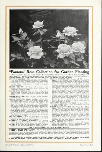| Keywords: Peonies for pleasure (16208407428).jpg Famous Rose Collection for Garden Planting <br> We guarantee that no better twelve Roses for <br> Collection Try them Price 15 cents each; any fo <br> year-old plants 25 cents each; any six for 1 25; <br> AXTOINE RIVOIRE This is the famous Mrs <br> Taft Rose of the fashionable Eastern markets <br> This Rose is in a class by itself; no Rose ever <br> produced has such substance of petal; color <br> creamy-white with rainbow tints; a beauty <br> and a wonder <br> BESSIE BROWN A Rose of transcendent <br> beauty; of largest size; color pearl-white with <br> a delicate tinge of fawn <br> ETOILE DE FRANCE For the best red garden <br> Rose it lies between this one Rhea Reid and <br> Helen Gould Some say one and some say the <br> other <br> ETOILE DE LYOX Still the best large golden- <br> yellow Rose <br> HELEN GOOD The Beauty Cochet What the <br> introducers say This is a true Cochet Rose <br> and after two years' trial in the garden we <br> pronounce it as g-ood if not better than any <br> Rose for the garden ever sent out We bought <br> the entire stock of this Rose paying 1 000 for <br> two plants this being by far the highest re- <br> corded price ever paid for any Rose The color <br> is a delicate yellow suffused with pink each <br> petal edged deeper very chaste and beautiful <br> The color with its immense size and exquisite <br> form makes it without question the greatest <br> Tea Rose ever introduced and we are proud to <br> have brought it out <br> HELEN GOULD A rich red Rose that is a great <br> bloomer; the shade of red has been described <br> best as a watermelon-red; elegant <br> KAISERIN AUGUSTA VICTORIA A grand <br> white garden Rose that has stood the test of <br> time Full and double; fine buds and flowers <br> LA FRANCE This is claimed by many to be the <br> queen of all the Roses; bright silvery-pink <br> TRY A COLLECTION OF <br> the garden were ever offered than this Famous <br> ur for 50 cents; the entire twelve for 1 25; two- <br> the entire twelve for 2 25 <br> MAMAN COCHET The Queen of All Garden <br> Hoses Such beauty and exquisite form as is <br> possessed by this variety is well-nigh marvel- <br> ous and cannot be seen in any other Rose we <br> know of The buds are beautiful large full <br> and firm and elegantly pointed; as they expand <br> they show great depth and richness sometimes <br> measuring two and a half inches from base to <br> tip Flowers superb when open extra large <br> perfectly double and of splendid substance <br> Small pot plants will in the open ground <br> quickly make large strong bushes and pro- <br> duce on long stiff stems great numbers of <br> perfect flowers that are enchanting in fra- <br> grance and delicate brightness The color is <br> rich clear pink changing to a silvery-rose <br> As we see it one good Rose like any of the <br> Cochet Roses is worth a whole collection of <br> poor ones at any price <br> SOUVENIR DE PRES CARNOT A grand Rose <br> of the largest size; color a delicate fawn or <br> salmon; extra fine <br> WHITE MAMAN COCHET No Finer Rose Than <br> This This Rose attracted our attention from <br> the very first time we ever saw it in flower <br> It is of the largest size and as you will notice <br> the flower is built up or rounded and very <br> double The color is a pure snow-white <br> Sometimes outdoors it is tinged pink which <br> only adds to its great beauty No Rose sur- <br> passes it in vigorous growth and in the im- <br> mense size of its buds and flowers indeed <br> nothing in the Tea family approaches it in <br> size Deliciously fragrant <br> WM R SMITH This Rose has several names <br> such as Charles Dingee Jeanette Heller <br> Maiden's Blush etc Color delicate blush It <br> has no superior as a garden Rose <br> OUR FAMOUS ROSES <br> DlDpiC AMD PF'OMTri' Did you know nat by planting Peonies in your gardens and yards that you <br> Dll \ lSiJ t\LVlS 1 LVIVILJ -will attract the birds Such birds as the brown thrush flickers Jenny wrens <br> etc will rest in every available space about the Peonies There is honey gathers or exudes from Peony buds Ants en- <br> joy this honey and the birds enjoy the feast of ants and you will enjoy the birds The ants do no harm whatever to <br> the Peonies Mrs William Crawford <br> REMEMBER that we publish a booklet for the trade PEONIES FOR PROFIT This will be mailed for the asking <br> to those that are dealers THERE IS MONEY IN PEONIES FOR CUT FLOWERS Write for it today <br> Miss Ella V Baines Springfield Ohio <br> Page Thirty-five 41910009 131358 64860 Text http //www biodiversitylibrary org/page/41910009 1917 10 1080/00222939009460791 Ella V Baines Firm ; Henry G Gilbert Nursery and Seed Trade Catalog Collection Biodiversity Heritage Library Miss Ella V Baines the woman florist Springfield Ohio Peonies for pleasure Garden Stories Bulbs Plants Catalogs Flowers Peonies Plants Ornamental Seed industry and trade Seeds Trade catalogs U S Department of Agriculture National Agricultural Library bhl page 41910009 dc identifier http //biodiversitylibrary org/page/41910009 bhlGardenStories BHLinbloom bulbs plants plants ornamental u s department of agriculture national agricultural library bhlgardenstories bhlinbloom Information field Flickr posted date ISOdate 2015-01-29 CC-BY-2 0 BioDivLibrary https //flickr com/photos/61021753 N02/16208407428 2015-08-25 01 52 58 cc-by-2 0 PD-old-70-1923 Peonies for pleasure Photos uploaded from Flickr by FĂŚ using a script |
