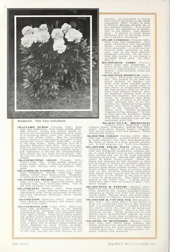 Keywords: Peonies for pleasure (16370047126).jpg of Claire Dubois without using a <br> few adjectives is beyond our comprehension <br> You cannot say too much in her praise Say <br> all you can and then you have left something <br> unsaid <br> 89 CLEMENTINE GILLOT Crousse 1885 <br> Crown type; late Large double flowers of <br> great beauty; color a uniform shade of light <br> tyrian rose Strong erect tall grower; very <br> good <br> 349 COMTE DE NANTEUIL Calot 1858 Bomb <br> type; midseason Guards violet-rose collar <br> lighter center clear salmon-pink Fragrant <br> A really good Peony A perfect mass of bloom <br> 183 CONSTANT DEVHED Calot 1868 Rose <br> type; very late Very large full flower dark <br> carmine-rose with chatoyant reflex One of <br> the best brilliant red varieties <br> 237 COQUELIN Dessert 1905 Semi-double <br> type; early Large glorious bloom of perfect <br> cup-shaped form petals imbricated bright ty- <br> rian-rose becoming distinctly silver tipped <br> Very rare <br> 83 COQUETTE Lemoine 1915 Bomb type <br> Late medium sized globular full flower; flesh <br> overlaid with white <br> 128 COURONNE d'OR Calot 1873 Semi-rose <br> type; late midseason This is the famous <br> Crown of Gold Immense very full imbricated <br> ball-shaped bloom Solid and compactly built <br> from edge to center Color snow-white reflect- <br> ing golden-yellow stamens that show through <br> the petals when looking at the flower from the <br> side These stamens light up the whole flower <br> with a glow that is simply indescribable and <br> which suggests the name Crown of Gold <br> Delicate carmine pencilings on edges of a few <br> central petals Incomparably lovely and one <br> of the very choicest and best Peonies in cul- <br> tivation An enthusiast on seeing <br> this variety blooming in our fields <br> exclaimed Why Crown of Gold <br> is Festiva Maxima dressed up in <br> her wedding clothes It is in our <br> opinion the attainment of perfec- <br> tion in the Peony One grower <br> says I believe I could detect <br> Couronne d'Or by its white water <br> lily fragrance anywhere <br> 157 DE CANDOLLE Crousse 1SS0 <br> Rose type; late midseason Very <br> large imbricated full cup-shaped <br> bloom; currant-red shaded with <br> vivid amaranth A novel and at- <br> tractive color blooming in clus- <br> ters One of the most effective <br> landscape varieties Do not over- <br> look this variety if you desire a <br> decidedly novel color No other <br> like it <br> 201 DOCTEUR ANDRY Calot <br> 1864 Rose type; midseason A <br> grand Peony that is very showy; <br> makes extraordinary strong <br> bushes Color purplish violet-red <br> Extra good <br> 119 DOCTEUR BOISDUVAL Guer- <br> in 1S50 Rose type; late midsea- <br> son The largest of all dark red <br> Peony flowers of regular fine <br> form with large rounded petals <br> A row or even a single plant of <br> this Peony is conspicuous among <br> the reds across a field for its bril- <br> liant dark maroon coloring Sim- <br> ply dazzling; nothing finer in all <br> dark red varieties It's a race be- <br> tween Dr Boisduval and Felix <br> Crousse as to which is the better <br> Peony although they in no way <br> conflict Dr Boisduval being much <br> darker than Felix Crousse Des- <br> sert in his manuscript on the <br> Peony says Doctor Boisduval <br> Guerin is like Delachei If this <br> is true then Dr Boisduval claims <br> precedence it being sent out in <br> 1850 while Delachei was not dis- <br> seminated until 1856 <br> 363 D O C T E U R BRETONNEAU <br> Guerin 1850 Rose type Large <br> compact flower midseason; guards pale lilac; <br> center milk-white shaded amber; fragrant <br> Tall strong grower; very free bloomer Extra <br> commercial variety <br> 52 DOCTOR CAILLOT Verdier 1856 Semi- <br> rose type; midseason A grand flower coming <br> in large clusters; rich fiery amaranthine-red <br> We doubt if there is a finer general purpose <br> red It 'will surprise you Very free bloomer <br> 5S7 DOCTOR EDGAR PLEAS Pleas 1900 <br> Anemone type This is one of the most beau- <br> tiful and 'wonderful productions without pol- <br> len or seed follicles such as man alone could <br> have created and one of the most delicately <br> charming of its type Guards light lilac-pink; <br> center of flower canary-yellow When the <br> bloom has obtained its full strength of stem <br> and heritage of beauty the petaloid filaments <br> in the center put on the airs of nobility by <br> donning snow-white plumes midway over the <br> bright yellow surface being of greater width <br> than on the recurved filaments themselves <br> each plume being cupped and curved like the <br> white caps on the waves of the ocean as if <br> it were on dress parade Mrs Pleas says in <br> regard to the yellow ones I think the Dr <br> Pleas best else I had not named it that Cer- <br> tainly unique <br> 327 DOCTEUR H BARXSBY Dessert 1913 <br> Rose type; late Very large full globular bloom <br> Color solferino-red tinged purplish-crimson <br> changing to clearer tint with very pronounced <br> bluish reflex Strong stems and good habit; <br> free bloomer in clusters; beautiful and showy <br> 795 DOCTOR H A AN DER TAK Nieuwenhuv- <br> zen 1916 The total effect of the flower is <br> wine red sometimes showing a few stamens <br> with a pronounced shade of crimson towards <br> the center while the rims of the petals are <br> shaded somewhat lighter This is a very free <br> blooming variety Stems strong and the red <br> flowers show off beautifully against the dark <br> shiny foliage First class certificate of merit <br> given by the Pomological Society of Boskoop <br> 316 DUKE OF DEVONSHIRE Kelway 1S96 <br> Rose type; late Extra large compact flat <br> bloom solferino-red narrow fringed petals in- <br> termingled with the wide petals; color effect <br> uniform deep rose Tall strong grower fra- <br> grant distinct and beautiful <br> Page Sixteen <br> Miss Ella V Baines Springfield Ohio 41910031 131358 64860 Pa