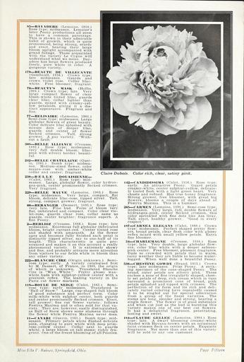 | Keywords: Peonies for pleasure (16394276951).jpg S5 BAYADERE Lemoine 1910 <br> Rose type; midseason Lemoine's <br> later jTeony productions all seem <br> to have a common parentage <br> This is shown in their admirable <br> habit of growth which is quite <br> pronounced being strong sturdy <br> and erect bearing their large <br> bloom upright accompanied with <br> grand foliage Those acquainted <br> with the variety Le Cygne will <br> understand what we mean Bay- <br> adere has large flowers produced <br> freely pure white in color A <br> gorgeous variety <br> 179 BEAUTE DE VILLECANTE <br> Gambault 1856 Crown type; <br> late midseason Guards and <br> crown violet rose Collar lilac- <br> white Free bloomer; fragrant <br> 76 BEAUTY'S MASK Hollis <br> 1904 Crown type; late Very <br> large compact flower of clear <br> blush-white tinted lilac guards <br> clear lilac collar lighter than <br> guards mixed with creamy-yel- <br> low petaloids giving it a dis- <br> tinct appearance Fragrant and <br> fine <br> 77 BELISAIRE Lemoine 1901 <br> Semi-rose type; midseason Large <br> globular flowers of great beauty <br> Color delicate lilac splashed with <br> minute dots of deeper lilac <br> guards and center of flower <br> flecked crimson Tall strong <br> grower A gay variety ' With- <br> out a fault <br> 30S BELLE ALLIANCE Crousse <br> 1892 Rose type; midseason; <br> very full double bloom; lilac- <br> pink with silverv border; beauti- <br> ful <br> 242 BELLE CHATELAINE Guer- <br> in 1861 Bomb type; midsea- <br> son Medium-sized flower color <br> mauve-rose with amber-white <br> collar and center; fragrant <br> 230 B E L L E DOUAISIENNE <br> Calot 1861 Rose type; mid- <br> season Large globular flower color hydran- <br> gea-pink center prominently flecked crimson <br> Very fragrant <br> 229 BELLE MAUVE Lemoine 1903 Rose <br> type; midseason Very large compact flat <br> bloom delicate lilac-rose tipped silver Tall <br> strong compact grower; fragrant <br> 66 BERANGER Dessert 1895 Rose type; <br> very late Fine bud Form of bloom very <br> flat imbricated and compact Color clear vio- <br> let-rose guards clear rose collar same as <br> guards center brighter; fragrance superb A <br> fine Peony <br> 2 BEBLIOZ Crousse 1886 Rose type; late <br> midseason Enormous full globular imbricated <br> bloom bright currant-red Center tinted rose <br> and shaded with amaranth As the flower <br> ages and becomes fully finished each petal is <br> distinctly tipped silver say to one-half of its <br> length This characteristic is quite pro- <br> nounced and makes it on this account a really <br> phenomenal variety It is extremely showy <br> and fine and probably attracts more attention <br> from visitors to our fields while in bloom than <br> any other variety <br> 222 BLANCHE CIRE Origin unknown Semi- <br> rose type; early A variety catalogued first <br> by M Dessert of France in 1908 the origin <br> of which is unknown Translated Blanche <br> Cire is Wax White Pretty glossy wax- <br> white buds with sulphur-yellow center with a <br> greenish reflex The leading variety in the <br> Paris cut flower markets <br> 118 BOULE DE NEIGE Calot 1862 Semi- <br> rose type; early midseason Translated is <br> Ball of Snow Large cup-shaped full bloom <br> of good substance and perfect form Color <br> milk-white with sulphur center both guards <br> and center prominently flecked crimson Erect <br> tall grower; fine cut flower variety; follows <br> Festiva Maxima and is often sold for that va- <br> riety They are however easily distinguished <br> as Ball of Snow shows some stamens through <br> the flower while Festiva Maxima never does <br> 11 CANARI Guerin 1861 Bomb type; mid- <br> season Primary petals white flushed delicate <br> pink changing to pure white with deep prim- <br> rose-yellow center Collar next to guards <br> white; a large bloom on tall stems; richly fra- <br> grant One of the freest blooming of all Peonies <br> Claire Dubois Color rich clear satiny pink <br> 142 CANDID1SSIMA Calot 1856 Rose type; <br> early An attractive Peony Guard petals <br> creamy-white center sulphur-yellow delicate- <br> ly tinted flesh with a light green heart Very- <br> chaste and refined Has true honey fragrance <br> Strong grower free bloomer with great big <br> flowers; blooms a couple of days ahead of <br> Festiva Maxima This is a hummer <br> 265 CARMEN Lemoine 1898 Semi-rose type; <br> midseason Very large full double flowers of <br> hydrangea-pink center flecked crimson this <br> color sprinkled with fine dots like Asa Gray <br> Tall erect healthy grower Good in every <br> respect <br> 187 CARNEA ELEGANS Calot 1860 Crown <br> type; midseason Perfect shaped pretty flow- <br> ers broad petals clear flesh color with glossy <br> reflex mixed with small yellow petals Extra <br> fine bloomer <br> 34 CHARLEMAGNE Crousse 1880 Rose <br> type; late Very double large globular flow- <br> ers color lilac white with a deeper salmon- <br> pink center Free bloomer pleasant fragrance <br> Buds so crowded with petals that in warm <br> rainy weather they are liable to become water- <br> logged When well done a beautiful Peony <br> 536 CHESTINE GOWDY Brand 1913 Crown <br> type; late midseason Prize Peony A strik- <br> ing specimen of the cone-shaped Peony The <br> broad outer petals are silvery pink These <br> enclose a zone of fine irregularly shaped close- <br> ly set petals of deep rich cream which in turn <br> surround a prominent cone of broad pink <br> petals splashed and tipped with crimson The <br> perfection of its form and its rich and deli- <br> cately varied coloring have repeatedly caused <br> it to be singled out for special admiration <br> from a group of the finest varieties The <br> stems are long slender and strong bearing a <br> single flower The flower is of good substance <br> and when cut just as the bud is bursting this <br> variety makes one of our best cut flowers <br> It has a delightful fragrance penetrating <br> lasting and sweet 