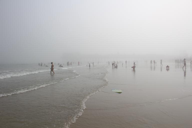 Keywords: people beach foggy dull person water ocean sea murky hazy weather swimming vacation activity