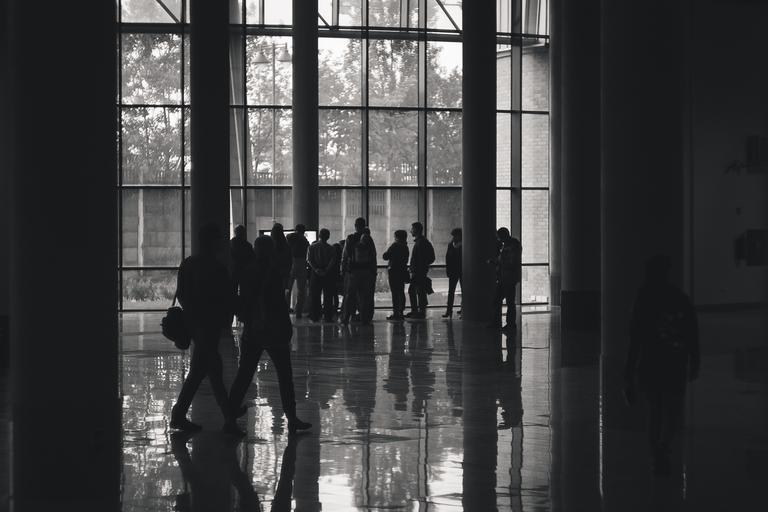 Keywords: people the interior of the hall shadows building office building black and white black white reflection the window silhouettes the crowd poland the pillars of the architecture building glass