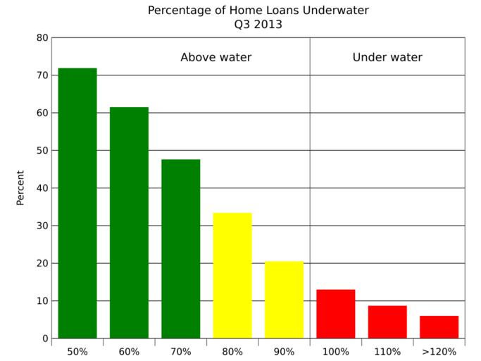 | Keywords: Percentage of US Home Loans Underwater Q3 2013.svg translate yes en Percentage of United States home loans underwater 3rd quarter 2013 http //www corelogic com/about-us/news/corelogic-reports-791 000-more-residential-properties-return-to-positive-equity-in-third-quarter-of-2013 aspx The x axis is loan to value LTV 2016-08-11 own Delphi234 other versions cc-zero Mortgage crisis | ||||