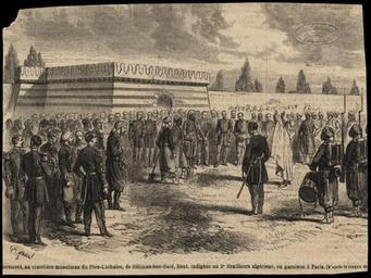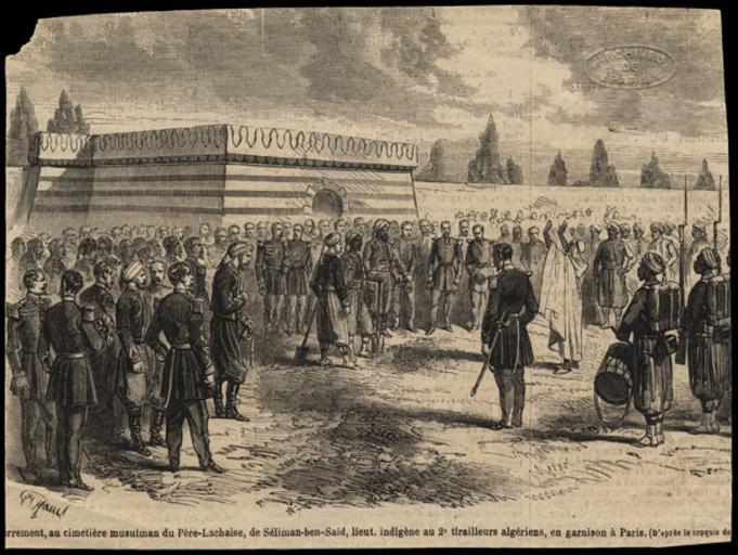 Keywords: Père-Lachaise - Division 85 - enclos musulman 01.jpg Enterrement dans l'enclos musulman division 85 du cimetière du Père-Lachaise de Séliman-ben-Saïd lieutenant indigène au 2e régiment de tirailleurs algériens en garnison à Paris D'après le croquis de Gideon Baril 1865-04-08 Archives de Paris object history exhibition history credit line accession number 15Fi 582 http //www paris fr/politiques/Portal lut page multimedialist id 214 pnumber 7 page_id 149 pop 1 paris fr cite journal Maxime Vauvert Enterrement de Seliman-ben-Saïd Le Monde illustré 1865-04-08 221 16 417 http //gallica bnf fr/ark /12148/bpt6k6224535d/f12 PD-old Gustave Janet Gédéon Baril Grave of Séliman-ben-Saïd Père-Lachaise Cemetery in the 19th century Engravings of the Père-Lachaise Cemetery 1865 in art |