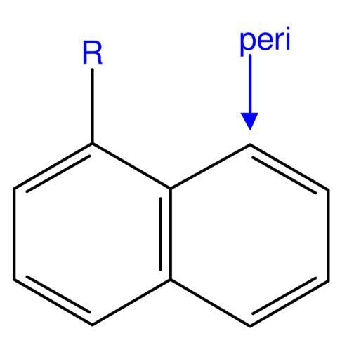 | Keywords: Peri arene substitution.svg Depction of peri- substitution in a naphtalene Made with the free software program ChemTool Own 2007-05-31 isilanes Check categories 2008 November 22 en wikipedia Arene_substitution_patterns de wikipedia Substitutionsmuster pt wikipedia Padrões_de_substituição_de_arenos Aromatics Aromatics |