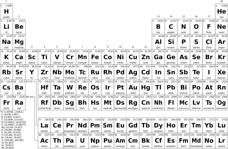 | Keywords: Periodic table simple pl bw.svg en Simple periodic table with localized element names and standard atomic weights IUPAC 2009 Temporarily converted to paths till fixing Wikipedia s font problem with DejaVu Sans Condensed but also the previous version of this image works correctly outside of Wikipedia 2013-11-04 01 26 03 own LĂĄszlĂł NĂ©meth Source code ; Created in LibreOffice 4 1 2 with this LibreLogo program ; Usage Put this code into an English language document in LibO Writer ; fix one program line for older LibreOffice versions see FIXME in the code ; and click on the Start icon of the View»Toolbars»Logo toolbar ; NEED INTERNET CONNECTION TO RUN THIS PROGRAM table data downloaded from Wikipedia lang input Language af ca cs de el en et fi fr it nl pt pt-br bw int input Color 0 COLORED 1 BLACK/WHITE ; Source pages http //www wikidata org/wiki/Q13584100 ; data fields Wikipedia page column of element names sorting by this column optional sources ru D0 A1 D0 BF D0 B8 D1 81 D0 BE D0 BA_ D1 85 D0 B8 D0 BC D0 B8 D1 87 D0 B5 D1 81 D0 BA D0 B8 D1 85_ D1 8D D0 BB D0 B5 D0 BC D0 B5 D0 BD D1 82 D0 BE D0 B2 2 fr Liste_des_ C3 A9l C3 A9ments_chimiques 2 de Liste_der_chemischen_Elemente 1 3 el CE 9A CE B1 CF 84 CE AC CE BB CE BF CE B3 CE BF CF 82_ CF 87 CE B7 CE BC CE B9 CE BA CF 8E CE BD_ CF 83 CF 84 CE BF CE B9 CF 87 CE B5 CE AF CF 89 CE BD_ CE BA CE B1 CF 84 CE AC_ CE B1 CF 84 CE BF CE BC CE B9 CE BA CF 8C_ CE B1 CF 81 CE B9 CE B8 CE BC CF 8C 2 it Elementi_per_numero_atomico 2 hu K C3 A9miai_elemek_list C3 A1ja 3 ca Llista_d 27elements_per_nombre_at C3 B2mic 2 no Grunnstoffliste 2 cs Seznam_chemick C3 BDch_prvk C5 AF 3 uk D0 A1 D0 BF D0 B8 D1 81 D0 BE D0 BA_ D1 85 D1 96 D0 BC D1 96 D1 87 D0 BD D0 B8 D1 85_ D0 B5 D0 BB D0 B5 D0 BC D0 B5 D0 BD D1 82 D1 96 D0 B2 2 et Keemiliste_elementide_loend 2 nl Lijst_van_elementen 2 3 fi Luettelo_alkuaineista 2 3 eo Listo_de_kemiaj_elementoj_la C5 AD_atomnumero 3 pt Anexo Lista_de_elementos_qu C3 ADmicos 2 sv Lista_ C3 B6ver_grund C3 A4mnen 2 3 af Lys_van_elemente_volgens_atoomgetal 2 pl Pierwiastki_chemiczne_wed C5 82ug_liczby_atomowej 2 IF lang en langpage sourceslang 20 langfield sourceslang 21 ; column with element names on the Wikipedia page IF COUNT sourceslang 2 3 langsort sourceslang 22 langsort 0 GLOBAL annotation posx posy size font font2 lang font DejaVu Sans font2 DejaVu Sans Condensed ; Wikimedia has got problem with it convert the result to path in Inkscape if needed posx 30 posy 40 size 42 ; load and process element data from Wikipedia embedded Python exec import urllib request exec data urllib request urlopen http //en wikipedia org/w/index php action raw title List_of_elements readlines exec table for j in i decode utf-8 replace style \\\ background-color 0x replace \\\ split for i in data if re match \ \d+ \ \ i decode utf-8 ; load and process other language data IF lang en exec data urllib request urlopen http // s wikipedia org/w/index php action raw title s readlines lang 2 langpage IF langsort > 0 exec langtable i decode utf-8 split d-1 split 0 split -1 strip \t split 0 split < 0 split 0 strip \t split -1 int i decode utf-8 split d-1 strip \t for i in data if re match \ \t \d+ \t \ \ i decode utf-8 langfield langsort exec import operator exec langtable sort key operator itemgetter 1 exec langtable i0 for i in langtable IF lang no exec data i decode utf-8 replace replace encode utf-8 for i in data IF lang pl exec data i decode utf-8 replace 0 replace replace \x27 encode utf-8 for i in data exec langtable i decode utf-8 replace <td> replace </td> split d split / 0 strip split -1 split 0 for i in data if re match <tr><td> \ \d+ </td> \ \ i decode utf-8 langfield-1 langtable ; a few fixes table793 Mercury ; instead of Mercury element table117 24 31 ; Mg table257 55 85 ; Fe table637 157 3 ; Gd ; add missing positions TO the table FOR i IN RANGE 56 71 tablei5 i 56 4 tablei6 8 5 FOR i IN RANGE 88 103 tablei5 i 88 4 tablei6 9 5 IF lang pt OR lang pt-br FOR i in 1 HidrogĂ©nio/HidrogĂȘnio 7 Azoto/NitrogĂȘnio 8 OxigĂ©nio/OxigĂȘnio 10 NĂ©on/NeĂŽnio 18 Ărgon/ArgĂŽnio 33 ArsĂ©nio/ArsĂȘnio 34 SelĂ©nio/SelĂȘnio 36 CrĂpton/CriptĂŽnio 40 ZircĂłni/ZircĂŽni 42 MolibdĂ©nio/MolibdĂȘnio 44 RutĂ©nio/RutĂȘnio 51 AntimĂłnio/AntimĂŽnio 54 XĂ©non/XenĂŽnio 74 TungstĂ©nio/TungstĂȘnio 75 RĂ©nio/RĂȘnio 86 RĂĄdon/RadĂŽnio 93 NeptĂșnio/NetĂșnio 94 PlutĂłnio/PlutĂŽnio 97 BerkĂ©lio/BerquĂ©lio 99 EinstĂ©nio/EinstĂȘnio 103 LaurĂȘncio/LawrĂȘncio IF lang pt-br ptbr 1 ptbr 0 langtablei0-1 i1 split / ptbr ; helper functions TO width_of_last_object OUTPUT _ drawpage getByIndex _ drawpage getCount -1 getSize Width / 100 __MM_TO_PT__; IN PT END ; FIXME remove the space before the END TO delete_last_object _ drawpage remove _ drawpage getByIndex _ drawpage getCount -1 END TO element size d l18n bw PENUP POSITION posx + INT d5 size posy + FLOAT d6 size 1 2 HEADING 0 ; show group number IF INT d0 IN 1 2 4 5 6 7 8 9 21 22 23 24 25 26 27 28 29 30 IF lang in af ca en eo no pl pt pt-br sv FORWARD size/2 + size/5 LABEL 0 1 d5 FORWARD size/2 + size/5 LABEL 0 4 5 d5 groupname 1 I ŻA 2 II ŻA 3 III ŻB 4 IV ŻB 5 V ŻB 6 VI ŻB 7 VII ŻB 8 9 VIII ŻB 10 ź 11 I ŻB 12 II ŻB 13 III ŻA 14 IV ŻA 15 V ŻA 16 VI ŻA 17 VII ŻA 18 VIII ŻA d5 IF lang not in hu groupname SUB groupname FONTSIZE 10 LABEL 0 1 groupname BACK size/2 + size/5 IF bw FILLCOLOR WHITE FILLCOLOR INT d1 PENDOWN RECTANGLE size size 1 2 PENUP IF M IN d2 OR m IN d2 OR 2 < COUNT d2 FONTFAMILY font2 FONTFAMILY font FONTWEIGHT BOLD FONTSIZE size/2 1 TEXT d2 FONTWEIGHT UPRIGHT FONTFAMILY font BACK size 1 2/2-size/20 fontsiz 5 6 FONTSIZE size/fontsiz IF l18n name l18nINT d0 -1 name d3 if lang de name name lower LABEL 0 1 name fontdescratio 492/2048 ; DejaVu Sans Condensed IF width_of_last_object > size 0 95 delete_last_object FONTFAMILY font2 LABEL 0 1 name width width_of_last_object IF width > size 0 95 delete_last_object fontsiz2 siz