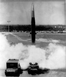 Keywords: Pershing 1 (17 April 1963).png en Perfect Pershing ” Pershing artillery missile blasts off on start of successful 190-mile flight after it was bounced on it carrier vehicle over rugged terrain to simulate battlefield conditions This Pershing was the first fired by an all-Army crew which had to use an age-old battlefield tool ” a sandbag ”before it could be launched Sandbag was placed under one side of carrier vehicle when concrete benchmark on which it rested was out of line 1963-04-17 Scan of photo U S Army other versions PD-USGov Pershing missile launches |