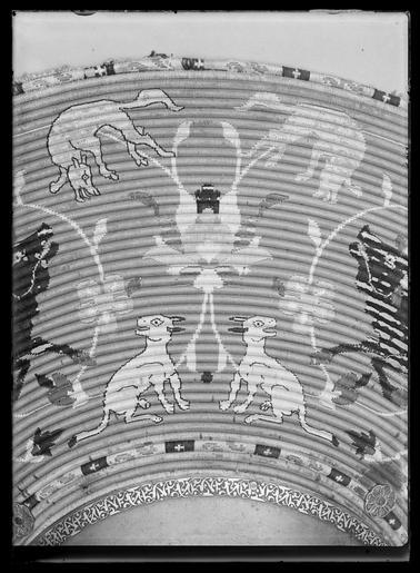| Keywords: Persisk sköld, kalkan, 1500-talets slut. Förmodat krigsbyte från Prag 1648 - Livrustkammaren - 60812.tif Rund sköld uppbyggd av 42 stycken synliga ringformade vidjor av fikonträ lindade och broderade med silkestråd i rött grönt gult svart grått och vitt <br/>All kanttråd fäst i längs fiberriktningen rakt dragna skåror i träet Kanttråden till alla figurer och ornament fästad på detta sätt möjligen även den röda bottentråden <br/>Yttersta ringen med dekor av parvis oregelbundna ornament i rött mellan dessa rektangel i svart med i mitten likarmat kors i vitt Detta mot botten i gult Nästa ring helt i grönt Därefter större fält med djur över slingrande växter Fyra större grupper av oxe i svart med vita horn och ögon bakifrån attackerad av panter i grått med vita ögon och klor Mellan dessa två olika grupper av i mitten stiliserad växt med i de fyra hörnen ett hunddjur vid sköldens inre kant sittande och mot yttre kanten i rörelse Hundarna i gult med svart kant vita ögon och i vissa fall svarta öron Grupperna skiljer sig åt genom djurens utseende och detaljer Av totalt 16 djur saknar tre helt ifyllda detaljer i svart De tre översta ringarna närmast sköldbucklan är heltäckande grön gul med dekor som nertill och heltäckande grön Då sköldbucklan sitter snett kan även en ytterligare heltäckande röd ring ses från ett håll <br/>Undersida av grön sammet I kanterna fyra rostbruna metallöglor på konturerad stålplatta Mot ena sidan två liknande och tätare placerade öglor mellan dem ett flätat snöre av grön silkestråd med i ena änden tofs <br/>I mitten fyrkantig stoppad kudde puta av röd sammet 185 x 195 mm Undersidan klädd med ett ljusare rött tyg än ovansidan I varje hörn genom putan en fästad ögla med snöre i orange och blått Snörena möts och är fäsade i en lös ring över kuddens mitt <br/><br/>Sköldbuckla rund och välvd i stål diam ca 140 mm h ca 90 mm I yttre kant dekorativt band av förvanskade arabiska skrivtecken b 11 mm Upptill avslutad med rund knopp diam nertill 34 mm h 38 mm Svagt avsmalnande uppåt med konisk topp Runt knoppen 19 mm brett band av arabesk Sidorna med dekor av samma förvanskade skrivtecken som tidigare Den koniska toppen täckt med arabesk All dekor av påslaget guld mot mörk botten Fäst i nederkantkant med fyra mässingsstift <br/><br/>Förgyllda och dekorativa ornament sammanlagt tio stycken sex längs nedre kant och fyra runt bucklan Konturerade kanter med i mitten åttbladig blomma mot prickpunsad botten diam 19 mm Ornamenten utgör fästen för öglorna på sköldens baksida original caption Erövringen av Prag century 16 steel - velvet Färg grön röd material sammet size mm 595 size mm 250 mittplatta ca LRK Kristina av Sverige Abbas I Shah av Persien Rudolf II Tysk-romersk kejsare Persisk konst i Sverige 1973 Livrustkammarens basutställning 1978 Islamiskt i de kungliga samlingarna 1984 Kungens lockpipa 1995-1996 Sweden and Europe 1632-1792 2003-2004 Krigsbyte 2007-2008 Basutställning place of origin original filename LN_B06007_008887 47190 inventory number LRK 10607 60812 CC0 Persisk sköld kalkan 1500-talets slut Förmodat krigsbyte från Prag 1648 - Livrustkammaren - 60812-negative tif <gallery caption Different images of same object > File Persisk sköld kalkan 1500-talets slut Förmodat krigsbyte från Prag 1648 - Livrustkammaren - 69021 tif File Rörsköld - Kalkan - Livrustkammaren - 60063 tif </gallery> Kalkan shield Media contributed by LSH unmatched event Media contributed by LSH unmatched material Media contributed by LSH dim-with multiple size templates Shield images from Livrustkammaren Media contributed by LSH 2013-10 |