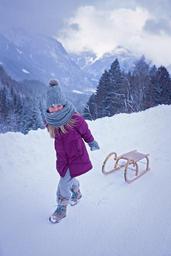 Keywords: person human child girl toboggan slide winter snow cold uphill away in motion