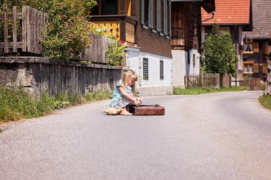 Keywords: person human child girl schulweg village road schoolbag leather case teddy teddy bear day sunny country life