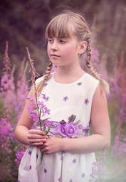 Keywords: person human child girl blond dress flowers braids face out nature portrait