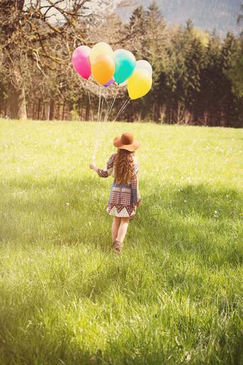 Keywords: person human female girl balloons colorful nature out green sunshine