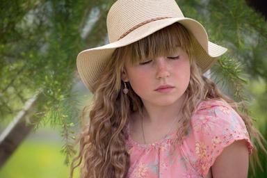 Keywords: person human girl female blond long hair hat face out nature relaxed enjoy silent portrait close