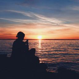 Keywords: person silhouette sitting typing cell phone smartphone texting woman female young girl seaside coast shore water ocean sea sunset reflection colors backlight dusk evening scene