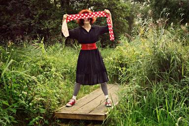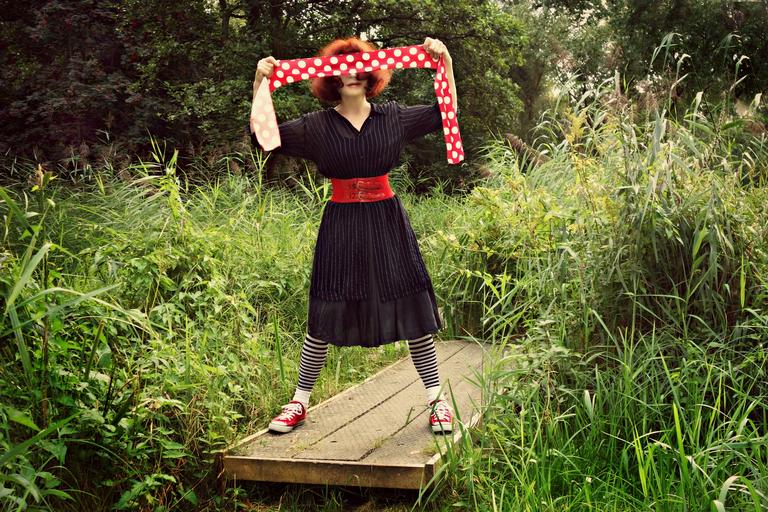 Keywords: person woman model pose fashion posing style female polka dot scarf blindfold black red stripes black-white stripes scene natural surroundings