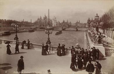| Keywords: Perspective sur la Seine, vue prise du pont Alexandre III.jpg View of the Seine river during the 1900 Paris World Fair On the left side of the image one can see the foreign pavilions and the Eiffel Tower On the other side of the river the two minaret-like towers of the Trocadéro are also visible as well as the Pavilion de la ville de Paris Pavilion of the city of Paris which is the building standing next to the bridge 1900 photograph 12 x 18 5 cm Institution Brown University Library object history exhibition history credit line Published in N D Exposition universelle de 1900 album of 50 fine photographic views Paris 1900 accession number 1303846952515627 PD-old Images of Paris from the Brown University Library Exposition universelle de 1900 album of 50 fine photographic views Exposition Universelle 1900 |