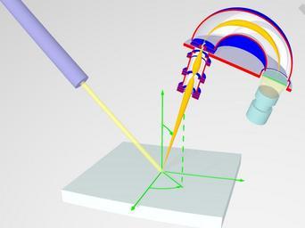 | Keywords: PES3.jpg en principle of Angle Resolved Photo Electron Spectroscopy Own Saiht 2009-06-15 Script in POVray <pre> // Schnitt durch ein PhotoelectronSpetroskopie Experiment // by Matthias Kreier version 0 8; global_settings assumed_gamma 1 0 default finish ambient 0 6 diffuse 0 4 include colors inc include textures inc camera ultra_wide_angle angle 48 location <20 30 -65> look_at <-2 12 0> //plane <0 1 0> -1 pigment color Red //plane <0 0 -1> -50 pigment color White plane <0 1 -1> -2000 pigment color LightGray // Linsensystem zur Fokussierung und Retardierung declare Linsensystem union difference union box <-2 1 3 0 -2 1> <2 1 3 2 2 1> box <-2 1 3 4 -2 1> <2 1 3 6 2 1> box <-2 1 3 8 -2 1> <2 1 4 0 2 1> box <-2 1 6 8 -2 1> <2 1 7 0 2 1> pigment color Blue cylinder < 0 2 9 0 > <0 7 1 0> 0 81 pigment color Silver cylinder < 0 2 9 0 > <0 7 1 0> 2 pigment color Silver inverse difference union cylinder < 0 4 2 0 > <0 4 4 0> 2 1 cylinder < 0 4 3 0 > <0 6 5 0> 1 4 cylinder < 0 6 4 0 > <0 6 6 0> 2 1 cylinder < 0 7 2 0 > <0 7 4 0> 2 1 cylinder < 0 7 3 0 > <0 9 9 0> 1 4 cylinder < 0 9 8 0 > <0 10 0> 2 1 cylinder < 0 10 2 0 > <0 10 4 0> 2 1 cylinder < 0 10 3 0 > <0 11 2 0> 1 4 cylinder < 0 4 1 0 > <0 11 0> 1 2 pigment color Silver cylinder < 0 10 9 0 > <0 11 3 0> 0 8 pigment color Silver cylinder < 0 4 1 0 > <0 11 3 0> 2 pigment color Silver inverse translate <0 1 0> declare Kugelanalysator union intersection // innere Kugel difference sphere <6 14 0> 4 2 texture Polished_Chrome sphere <6 14 0> 4 pigment color Blue box <1 14 -1> <11 19 5> pigment color Red intersection // äußere Kugel difference sphere <6 14 0> 8 pigment color Blue sphere <6 14 0> 7 8 pigment color Silver box <-3 14 -1> <15 23 9> pigment color Red difference // Herzog-Platte cylinder < 6 12 5 0 > < 6 13 0 > 9 pigment color LightSteelBlue cylinder < 0 12 4 0> <0 13 1 0> 1 1 pigment color Silver cylinder < 12 12 4 0> <12 13 1 0> 2 3 difference cylinder < 12 12 5 0 > < 12 13 8 0 > 2 4 pigment color Blue cylinder < 12 12 4 0> < 12 13 9 0> 2 2 pigment color Silver intersection // Eingangsspalte union box <-2 13 25 -2> <2 13 35 2> pigment color Blue box <-0 6 13 3 -2> <0 6 13 75 2> pigment color Blue box <-0 2 13 2 -2 1> <0 2 14 1 2 1> pigment color Silver inverse intersection // Eingangsblenden union cylinder < 0 13 85 0 > < 0 13 9 0 > 2 pigment color Blue cylinder < 0 13 1 0 > < 0 13 15 0 > 2 pigment color Blue box <-0 15 13 0 -1> <0 15 14 1 1> pigment color Silver inverse declare Optik union object Linsensystem pigment color Blue object Kugelanalysator rotate<0 0 0> declare Scienta union intersection // Linsensystem und Analysator entlang x aufgeschnitten object Optik box <-3 2 0> <15 23 9> pigment color Red intersection //aufgeschnitten union cylinder <12 13 3 0> <12 13 8 0> 2 pigment color CadetBlue // Channelplate cylinder <12 13 0 0> <12 13 2 0> 2 pigment color Green // Phosphorplatte box <9 10 0> <15 15 9> pigment color rgbf <1 1 1 1> difference // CCD Kamera cylinder <12 9 5 0> <12 11 0> 1 8 pigment color CadetBlue cylinder <12 10 0> <12 11 1 0> 1 6 pigment color Black cylinder <12 9 6 0> <12 8 0> 1 4 pigment color CadetBlue cylinder <12 8 1 0> <12 5 5 0> 1 8 pigment color CadetBlue cone <12 11 0> 1 6 <12 13 0> 2 texture pigment rgbf<1 1 0 8 0 7> // Weg der Elektronen declare Elektron1 union cone < 0 0 0 > 0 <0 21 5 0> 0 6 cone < 0 21 5 0 > 0 6 <0 23 0> 0 4 cone < 0 23 0 > 0 4 <0 24 2 0> 0 03 cone < 0 24 0 > 0 03 <0 25 0> 0 5 cone < 0 25 0 > 0 5 <0 26 0> 0 6 cone < 0 26 0 > 0 6 <0 27 0> 0 5 cone < 0 27 0 > 0 5 <0 29 5> 0 05 cone < 0 29 5 0> 0 05 <0 30 0> 0 1 intersection intersection torus 6 0 5 rotate<-3 8 0 0> translate <0 0 46 0> torus 6 0 5 rotate< 3 8 0 0> translate <0 -0 46 0> torus 6 0 7 translate <-0 67 0 0> torus 6 0 7 translate < 0 67 0 0> rotate<90 0 0> translate<6 30 0> // torus 6 0 1 rotate < 90 0 0 > translate<6 30 0> box <-2 30 -2> <13 39 2> declare Elektron2 union intersection intersection torus 6 0 5 rotate<-3 8 0 0> translate <0 0 46 0> torus 6 0 5 rotate< 3 8 0 0> translate <0 -0 46 0> torus 6 0 7 translate <-0 67 0 0> torus 6 0 7 translate < 0 67 0 0> rotate<90 8 0> translate<6 14 0> box <-2 14 -2> <13 23 2> cone < 0 11 0 9 > 0 2 <0 14 1 0 9> 0 05 cylinder < 0 5 95 0 9 > <0 11 0 9> 0 2 cone < 0 0 0 > 0 <0 6 0 9> 0 2 declare Elektron3 union intersection intersection torus 6 0 5 rotate<-3 8 0 0> translate <0 0 46 0> torus 6 0 5 rotate< 3 8 0 0> translate <0 -0 46 0> torus 6 0 7 translate <-0 67 0 0> torus 6 0 7 translate < 0 67 0 0> rotate<90 -10 0> translate<6 14 0> box <-2 14 -2> <13 23 2> cone < 0 11 -0 9 > 0 2 <0 14 1 -0 9> 0 05 cylinder < 0 4 95 -0 9 > <0 11 -0 9> 0 2 cone < 0 0 0 > 0 <0 5 -0 9> 0 2 declare Lichtquelle union cylinder <-18 18 0> <1 -1 0> 0 5 texture pigment rgbf<1 1 0 6 0 7> difference cylinder <-17 5 17 5 0> <-40 40 0> 1 8 cylinder <-17 4 17 4 0> <-20 20 0> 0 5 pigment color RichBlue declare Sample union box <-14 8 -2 5 -14 8> <14 8 0 14 8> pigment color LightBlue union // Koordinatensystem cylinder < 0 0 0 > < 16 1 0 0 > 0 1 cylinder < 0 0 0 > < 0 16 1 0 > 0 1 cylinder < 0 0 0 > < 0 0 -16 1> 0 1 cone < 16 0 0 > 0 3 < 17 0 0 > 0 cone < 0 16 0 > 0 3 < 0 17 0 > 0 cone < 0 0 -16> 0 3 < 0 0 -17> 0 intersection torus 8 0 1 box < 0 -0 1 -8 1 > < 5 66 0 1 -5 66> cylinder < 0 0 0 > < 6 0 -6 > 0 1 intersection torus 10 0 1 box < 0 -0 1 -10 1 > < 4 8 0 1 -4 8> rotate <90 45 0> cone < 5 66 0 -5 66 > 0 < 5 0 -6 3 > 0 3 cone < 3 38 8 8 -3 38> 0 < 2 5 9 3 -2 5> 0 3 pigment color Green cylinder < 5 66 15 -5 66> < 5 66 0 -5 66 > 0 1 pigment checker color Green color rgbf <1 1 1 1> // alles zusammenbauen object Scienta translate < 0 16 0 > rotate < -20 0 -20 > object Elektron1 pigment color Orange rotate < -20 0 -20 > //object Elektron2 pigment color rgbf <1 0 6 0 0 8> //object Elektron3 pigment color rgbf <1 1 0 0 8> object Lichtquelle object Sample // Lichtquellen light_source <-60 28 -200> color White light_source // <0 26 -20> // <30 30 -45> <20 30 -65> color White / light_source // Rückseit