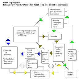 | Keywords: Peschls three loops extended to social construction.svg en <br>If critical inquiry is halted by removing the forum there is no path to knowledge except through mistake the forum may have been disrupted or perverted The obvious available option is to keep things working is to stay in the inner loop where there is only mistake Another option is to create connections to other boxes such as connecting mistake to the frame of reference but this will update the frame with mistaken information resulting in low esteem and depression and I am afraid desperation The poor esteem and efficacy created by mistake and motivated by depression to desperation will attract the wrong crowd such as desperadoes who will corrupt the framework for instance with cocaine or meth Another option to attempt is to create a connection to Values in an attempt to update the framework with healthy non-mistakes through morality--but two problems appear The value system found in Values will act to suppress or alter the desperation depression and low self esteem by for instance in Christianity forgiving those who caused the problem in the first place who destroyed the forum employers Or Value might be affected by the desperation and as happened to the framework attract desperadoes corrupting the values <br><br>The the Artifact that is central to constructivism http //web media mit edu/~mres/ Mitchel Resnick is not central to the diagram but has been pulled off into the employment loop except to borrow from the individual's and presumably the community's knowledge--but only as learned from mistake It is safe to say that values have not part in the employment cycle as it is illegal under business law to do anything that does not directly create shareholder profits Artifacts are crucial to constructivsm; they are the focus for instance of constructivst therapy; the artifact has been stolen <br><br>Where is education in this picture Constructivst education would be complete with the insertion of the Artifact into the center but didactic education has to be parallel as a business as it operates for profit even if it has been socialized As didactic information is supplied with little back talk ; this was mis-attunement to Carl Rogers as it was not the product of experience and probably misinformation So another box has been placed above Knowledge for inserted knowledge that is separate from the collective experience <br><br>This material is referenced in the http //en wikibooks org/wiki/User John_Bessa/Saving_Constructivism Original work-> http //thinman com/john_bessa/text/peschls_three_loops_extended_to_social_construction svg John Bessa 2011-12-20 Most recent version-> http //thinman com/john_bessa/text/peschls_three_loops_extended_to_social_construction svg Constructivism Social construction Sociology |