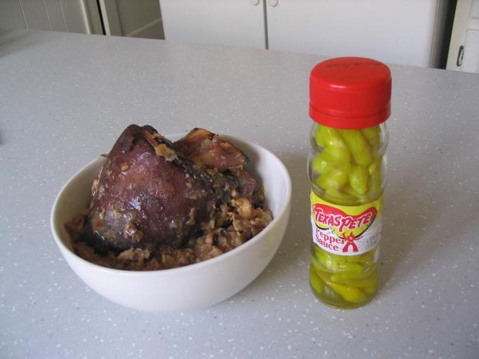 Keywords: Peteandpeas.jpg en Black-eyed peas with ham hock and pepper vinegar self-photographed Michel Aaij 2009-01-02 100px Ham food Peas dishes Vigna unguiculata Hot sauce Pork knuckle Pork dishes of the United States