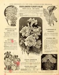 Keywords: Peter Henderson and Co.'s August to December 1901 wholesale catalogue of bulbs, plants and seeds, tools, fertilizers, insecticides, and requisites for the greenhouse, garden and farm (16236603263).jpg PETER HENDERSON CO NEW YORK ” SUPERIOR BULBS ” WHOLESALE <br> ORNITHOGALUM ARABICL'M <br> ORNITHOGALUM <br> ARABICUM <br> Star of Bethlehem A beautiful var- <br> iety throwing up a tall spike bearing <br> numerous large milk-white star- <br> shaped flowers with a black centre <br> and having a distinct aromatic per- <br> fume Largely forced by florists for <br> cut flowers <br> 36c per doz 1 50 per 100 12 00 per 1000 <br> ALLIUMS <br> FOR WINTER FORCING <br> Hermittl Grandiflorum A splendid <br> winter flowering and forcing variety ; <br> the flowers of immaculate whiteness <br> last a long time after being cut <br> Blooms from December to the end of <br> April <br> 16c per doz 75c per 100 0 50 per 1000 <br> Neapolltanum Another excellent var- <br> iety for winter flowering extensively- <br> forced by florists for cut flowers be- <br> ing of pure white with green stamens <br> borne in large loose umbels <br> 10c per doz 50c per 100 4 50 per 1000 <br> MISCELLANEOUS FLORIST'S BULBS <br> WHITE CAJXAS DRY ROOTS <br> The dry bulbs are superior for forcing purposes as they come into bloom <br> quickly and require less room ” making less foliage Dry bulbs planted in 4-inch <br> pots will flower nearly twice as abundantly as plants in 6-inch pots that have <br> been kept growing or only semi-dormant Delivery in Sep ember <br> PRICE OF DRY CA'LLA ROOTS <br> Mammoth Bulbs 6 ins and over in circumference 1 25 doz 10 00 100 <br> Extra Size 5 1 00 7 50 <br> First Size 4 ' –  75 5 00 <br> V \tt\e Oem or lomjhumb about 12 inches high 50 3 0 <br> Dwa -f Everblooming pure while early free 2 50 18 00 <br> Elliottiana rick yellow foliage spotted white 2 00 each 20 00doz <br> CALLA ELLIOTTIANA <br> CAMPERNELLE <br> JONQUILS <br> Much prized for their large 6-lobed <br> golden yellow sweet-scented flowers <br> perfectly hardy and adapted for winter <br> forcing <br> 12c per doz 60c per 100 5 00 per 1000 <br> SPANISH IRIS <br> This type is well adapted for pot cul- <br> ture and forcing blooming in the win- <br> ter The flowers are of great beauty <br> and cut in the bud state last from one to <br> two weeks in bloom If planted in boxes <br> and placed in cold frames until they <br> show bud then brought into heat they <br> can be had in bloom from March on <br> British Queen Massive pure white <br> Leonidas Dark violet bine <br> Belle Chinoise Large golden yellow <br> Olympia Creamy yellow and light blue <br> Lllaceus Porcelain blue <br> Prince of Orange Yellow bronze and <br> blue <br> Prices of above named Spanish Iris <br> 12c per doz 65c per 100 5 00 per 1000 <br> Mixed Spanish Iris 10c per doz 85c <br> per 100 2 50 per 1000 <br> LILIUM CANDIDUM <br> SPANISH IRIS <br> LILIUM CANDIDUM <br> READY IN AUGUST <br> Annunciation Madonna or St Joseph Lily The well- <br> known Garden Lilv snow white fragrant blossoms It is <br> also one of the best forcing Lilies for florists Selected <br> large bulbs 50c per doz 3 50 per 100 32 00 per 1000 <br> LILIUM AURATUM <br> READY IN OCTOBER <br> First Size Bulbs S to o inch 0 85 doz 6 00 per 100 <br> Extra Large Bulbs 9 to 11 inch 1 25 8 50 <br> Mammoth Bulbs 11 to 13 inch 2 25 16 00 <br> For a Complete List of Lilies see page lb <br> We furnish 6 bulbs of one variety at dozen rates ; 25 at 100 rates ; 250 at 1000 rates Postage will be extra on bulbs desired by mail 42318929 133706 66577 Page 6 Text http //www biodiversitylibrary org/page/42318929 1901 10 5962/bhl title 66577 Henry G Gilbert Nursery and Seed Trade Catalog Collection ; Peter Henderson Co NameFound Calla elliottiana NameConfirmed Calla elliottiana W Watson W Watson EOLID 1127677 NameBankID 7553065 NameFound Grandiflorum NameFound Lilium auratum NameConfirmed Lilium auratum EOLID 1003309 NameBankID 5416786 NameFound Lilium candidum NameConfirmed Lilium candidum EOLID 1003297 NameBankID 2667845 NameFound Neapolltanum NameFound Ornithogalum NameConfirmed Ornithogalum L EOLID 29231 NameFound Ornithogalum arabicum NameConfirmed Ornithogalum arabicum EOLID 229708 NameBankID 5846637 Biodiversity Heritage Library Peter Henderson Co 's August to December 1901 wholesale catalogue of bulbs plants and seeds tools fertilizers insecticides and requisites for the greenhouse garden and farm Garden Stories Catalogs Fertilizers Flowers Insecticides Peter Henderson Co Plants Ornamental Seed industry and trade Seeds Trade catalogs U S Department of Agriculture National Agricultural Library bhl page 42318929 dc identifier http //biodiversitylibrary org/page/42318929 bhlGardenStories Bulbs Plants Lilium Candidum Callas Lilies Ornithogalum Arabicum BHLinbloom peter henderson co plants ornamental u s department of agriculture national agricultural library bhlgardenstories bulbs plants lilium candidum ornithogalum arabicum bhlinbloom Information field Flickr posted date ISOdate 2015-03-18 CC-BY-2 0 BioDivLibrary https //flickr com/photos/61021753 N02/16236603263 2015-08-24 19 59 27 cc-by-2 0 PD-old-70-1923 Callas lilium candidum Peter Henderson and Co 's August to December 1901 wholesale catalogue of bulbs plants and seeds tools fertilizers insecticides and requisites for the greenhouse garden and farm Photos uploaded from Flickr by FĂŚ using a script
