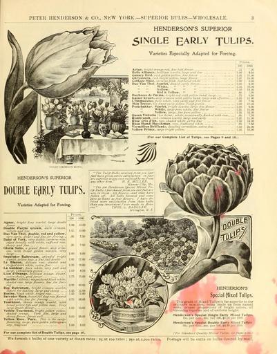 | Keywords: Peter Henderson and Co.'s August to December 1901 wholesale catalogue of bulbs, plants and seeds, tools, fertilizers, insecticides, and requisites for the greenhouse, garden and farm (16236601673).jpg PETER HENDERSON CO NEW YORK ” SUPERIOR BULBS ” WHOLESALE <br> HENDERSON'S SUPERIOR <br> S INGLE EARLY T ULIP5 <br> Varieties Especially Adapted for Forcing <br> Artus bright orange redefine bold flcnuer <br> Belle Alliance brilliant scarlet large and fine <br> Canary Bird rich golden yellow fine forcer <br> Chrysolora rich bright yellow large fiower <br> Cottage Maid carmine pink feathered white <br> Due Van Thol Scarlet dwarf early forcer <br> White <br> Yellow <br> Red Yellow <br> Duchesse de Parma bright red with yellow band large <br> Kaiser Kroon deep crimson with yellow band large and effective <br> L'lmmaculee /«r 'white -very early and file forcer <br> Mon Tresor the finest early yellow Tulip grown <br> Pottebakker Scarlet bright Scarlet large fine flower <br> White large pure white fine forcer <br> 11 Yellow large fine pure yellow <br> Queen Victoria La ReineJ white occasionally flushed with rose <br> Rembrandt rich crimson scarlet large and early <br> Rose oris d'lin rose shaded white extra fine <br> Rosa Mundi Huyckman rose feathered white <br> Vermillion Brilliants dazzling ver million extra fine <br> Yellow Prince large bright yellow <br> Prices <br> 100 I 1000 <br> so <br> 1 00 <br> 1 35 <br> 1 25 <br> 1 00 <br> 1 00 <br> 1 35 <br> 1 50 <br> 85 <br> 75 <br> 1 25 <br> 85 <br> 1 60 <br> 1 00 <br> 1 35 <br> 1 35 <br> 85 <br> 1 25 <br> 1 50 <br> S5 <br> ' 50 <br> 1 25 <br> r oo <br> 9 50 <br> 11 00 <br> lu OO <br> 9 00 <br> 8 00 <br> 12 00 <br> 14 00 <br> r oo <br> 6 50 <br> 11 00 <br> r oo <br> 15 U0 <br> 9 00 <br> 12 00 <br> 12 00 <br> 7 50 <br> 11 00 <br> 14 00 <br> r so <br> 22 00 <br> 10 00 <br> For our Complete List of Tulips see Pages ° and 10 <br> 1 ULIP CRIMSON KINO <br> HENDERSON'S SUPERIOR <br> DOUBLE EflRLy TULIPS <br> Varieties Adapted for Forcing <br> Agnes bright fiery scarlet large double <br> Jloiver <br> Double Purple Crown dark crimson <br> Z'elvety and jine <br> Due Van Thol double red and yellow <br> very early dwarf and Jine for forcing <br> Duke of York very double carmine rose <br> edged broadly -with white stiff ttsed rose <br> shozuy and fine <br> Gloria Solis a grand flower deep crim- <br> son ˘with broad golden margin very <br> large <br> Imperator Rubrorum splendid bright <br> scarlet yellow base a fine full double <br> Le Blason delicate rose shaded and <br> striped with white extra fine <br> La Candeur pure white very jull and <br> la rge extensively grown <br> Lion d Orange brilliant orange dwarf <br> extra choice good forcer <br> Murillo Albino magnificent blush white <br> shaded rose large flowers fine for forc- <br> ing <br> Rex Rubrorum bright crimson scarlet <br> superb for bed ling large and showy <br> Rosine blush ˘white tinged rose <br> Salvator Rosa beautiful deep rose flamed <br> with wh ite fine for forcing <br> Tournesol showy orange scarlet ˘with <br> broad yellow tips and yellow base Very <br> large double flower <br> Yellow Tournesol bright golden yellow <br> shaded orange Very fine large and <br> showy flower forces ˘well <br> Yellow Rose Pure This is the early- <br> flowering large pure golden yellow var- <br> iety fragrant <br> For our complete list of Double Tulips see page 10 <br> Special lixed Tulips <br> This grade of Mixed Tulips is far superior to the <br> ordinary mixtures being made up from named <br> sorts proper proportions of bright colors all <br> blooming together and of uniform height <br> Henderson's Special Single Early Mixed Tulips <br> 15c per doz 85c per 100 7 00 per 1000 <br> Henderson's Special Double Early Mixed Tulips <br> 18c per doz 90c per 100 8 00 per 10 <br> For Standard Quality Mixed Tulips sec pages Q-IO <br> We furnish 6 bulbs of one variety at dozen rates ; 25 at 100 rates ; 250 at 1 000 rates Postage will be extra on bulbs desired by mail 42318926 133706 66577 Page 3 Text http //www biodiversitylibrary org/page/42318926 1901 10 5962/bhl title 66577 Henry G Gilbert Nursery and Seed Trade Catalog Collection ; Peter Henderson Co NameFound Rubrorum NameFound Salvator NameConfirmed Salvator NameBankID 212455 NameFound Solis NameFound Tournesol NameConfirmed Tournesol Adans EOLID 5281101 Biodiversity Heritage Library Peter Henderson Co 's August to December 1901 wholesale catalogue of bulbs plants and seeds tools fertilizers insecticides and requisites for the greenhouse garden and farm Garden Stories Catalogs Fertilizers Flowers Insecticides Peter Henderson Co Plants Ornamental Seed industry and trade Seeds Trade catalogs U S Department of Agriculture National Agricultural Library bhl page 42318926 dc identifier http //biodiversitylibrary org/page/42318926 bhlGardenStories Tulips Bulbs Plants BHLinbloom peter henderson co plants ornamental u s department of agriculture national agricultural library bhlgardenstories bulbs plants bhlinbloom Information field Flickr posted date ISOdate 2015-03-18 CC-BY-2 0 BioDivLibrary https //flickr com/photos/61021753 N02/16236601673 2015-08-24 19 50 30 cc-by-2 0 PD-old-70-1923 Tulips Peter Henderson and Co 's August to December 1901 wholesale catalogue of bulbs plants and seeds tools fertilizers insecticides and requisites for the greenhouse garden and farm Photos uploaded from Flickr by Fæ using a script |