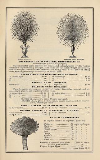 Keywords: Peter Henderson and Co's seed catalogue (16437049925).jpg GRASS BOUQUET <br> FEATHEB GEASS BOUQUET <br> ORNAMENTAL GRASS BOUQUETS IMMORTELLES c <br> All can be sent free by mail on receipt of price <br> The ornamental Grass Bouquets are composed of natural grasses dyed in various <br> colors and very beautifully arranged The colors are particularly bright and durable <br> and the bouquets form beautiful ornaments for filling vases in the parlor or sitting <br> room retaining their shape and beauty for several years <br> ROUND PYRAMIDAL GRASS BOUQUETS ” German <br> 14 inches high 0 50 <br> 18 60 <br> 22 1 00 <br> ENGLISH GRASS <br> Small size 75c j <br> 24 inches high 1 25 <br> 28 ' 1 50 <br> 30 2 00 <br> BOUQUETS <br> Large Size ' L 00 <br> FEATHER GRASS BOUQUETS <br> These bouquets are composed entirely of Feather Grass stipa pennata and are <br> exceedingly graceful and beautiful various colors <br> 2 00 <br> 3 00 <br> 18 inches high 0 60 <br> 20 <br> 22 <br> 1 00 <br> 1 50 <br> 24 inches high <br> 28 <br> 6 by <br> 5 by <br> 5fby <br> Feather Grass natural color 30 cents per bunch <br> Feathergrass green yellow orange mauve magenta each in separate <br> colors 50 cents per bunch <br> CORAL BASKETS OF EVERLASTING FLOWERS <br> 9 inches 1 00 7£ by 10 inches 1 50 <br> WILLOW BASKETS OF EVERLASTING FLOWERS <br> inches ¢ 1 00 I 6 by 10 inches 1 75 <br> 1 25 <br> FRENCH IMMORTELLES <br> In original bunches as imported See Cut <br> White 75 cents per bunch <br> Black 75 <br> Green 75 <br> Golden Yellow 50 <br> Blue ---- 75 ' ¢ <br> Orange 75 <br> Magenta 75 <br> Lilac 75 <br> Mixed 75 <br> Bronius a beautiful grass plain Each 25 cents <br> dyed in separate colors 40 <br> French Green Moss 30 <br> – perdozen 3 00 43797090 148915 77745 Page 91 Text http //www biodiversitylibrary org/page/43797090 1875 10 5962/bhl title 77745 Henry G Gilbert Nursery and Seed Trade Catalog Collection ; Peter Henderson Co NameFound Immortelles NameConfirmed Immortelles NameBankID 277118 NameFound Lilac NameConfirmed Lilac P Miller 1754 Biodiversity Heritage Library Peter Henderson Co's seed catalogue 1875 new album Garden Stories Catalogs Equipment and supplies Gardening Peter Henderson Co Seed industry and trade Seeds Trade catalogs U S Department of Agriculture National Agricultural Library bhl page 43797090 dc identifier http //biodiversitylibrary org/page/43797090 bhlGardenStories ornamental grass bouquets BHLinbloom peter henderson co u s department of agriculture national agricultural library bhlgardenstories bhlinbloom Information field Flickr posted date ISOdate 2015-02-03 CC-BY-2 0 BioDivLibrary https //flickr com/photos/61021753 N02/16437049925 2015-08-24 05 54 18 cc-by-2 0 PD-old-70-1923 1875 books Peter Henderson Co's seed catalogue Photos uploaded from Flickr by Fæ using a script |