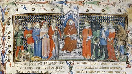 | Keywords: Petrarch-ranks-of-man-remediis-milan-braidense-ad-xiii-30-f1-c1400.jpg estates and conditions came from a Milanese manuscript of Francesco Petrarch's De Remediis Utriusque Fortunae c 1400 MS Biblioteca Nationale Braidense AD XIII 30 It is attributed to the workshop of Fra Pietro da Pavia a miniaturist active late 14th century It depicts the auctor addressing his work to an audience representing all Mankind from the highest the pope to the lowest a pauper and a jester Remediis consists of dialogues between the Passions Hope Fear Joy Sorrow and Virtue Reason and the lessons about Fortune apply to all The figures are assembled on grass with a diapered background Such decorative backgrounds were commonly seen in medieval miniatures being gradually replaced with landscapes in the 15th century This particular style is reminiscent of Provençal manuscripts From left to right the figures include Jester/Fool with a monkey red-beaked black bird cage of other birds ; Minstrel playing a lute ; Merchant with an open chest of money ; Doctor of Law with books ; Pope with a tiara and processional staff ; Petrarch enthroned in a Gothic cathedra with a pen and open book showing the incipit of Remediis Cum res fortunasque ; King crowned with orb scepter ermine trimmed robe ; Soldier with crossbow ; Gentleman with falcon and hounds ; Woman blond with red dress ; Shepherd/Pauper with ragged clothes sheep cudgel The text on the left side reads Francisci Petrarce laureati De Remediis utriusque fortune Liber primus incipit Scanned from Miniature a Brera 1100-1422 ed Federico Motta 1997 Workshop of Pietro da Pavia 1400 PD-old-100 PD-1996 Francesco Petrarca in miniatures Estates of the realm Illuminated manuscripts of Petrarch |