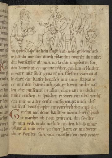 | Keywords: Pfaffe Konrad - Rolandslied - cod. pal. germ. 112 - 039.jpg Pfaffe Konrad - Rolandslied - cod pal germ 112 - jpg 038 040 Roland empfiehltmit verletzender Ironie Genelun als Gesandten Karl der Große beauftragt Genelun mit der Gesandtschaft an Marsilie Genelun lässt den Handschuh fallen Rolandslied des Pfaffen Konrad à bersetzung bzw Bearbeitung der altfranzösischen Chanson de Roland um 1100 Blatt 19r Pfaffe Konrad Rolandslied Pergament 123 Blatt 21x15 cm Regensburg/Hessen-Thüringen Ende 12 Jahrhundert Cod pal germ 112 Universitätsbibliothek Heidelberg http //diglit ub uni-heidelberg de/diglit/cpg112 century 12 Pfaffe Konrad PD-old Rolandslied Cod Pal germ 112 |