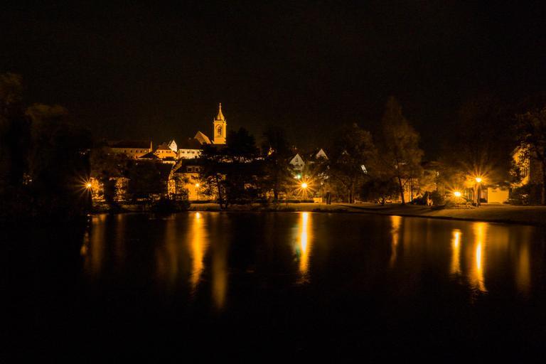 Keywords: pfullendorf city night photograph long exposure lake lake park kirch lights lighting building yellow architecture light gold orange night