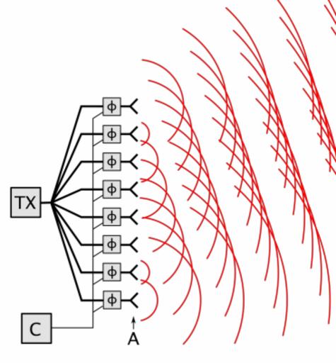 | Keywords: Phased array animation 10 frames 371x400px 100ms.gif phased array antenna works A phased array is a computer-controlled antenna which produces a beam of radio waves that can be steered electronically to point in different directions without turning the antenna They are widely used in military radar The phased array consists of an array of multiple identical antenna elements A driven by a transmitter TX The feed current for each antenna passes through a device called a phase shifter φ which is controlled by a computer control system C The moving red lines show the wavefronts surfaces of constant phase of the radio waves emitted by each antenna The waves of the individual antennas are spherical but they combine superpose in front of the antenna to make a plane wave a beam of radio waves traveling in a specific direction By progressively delaying the phase of each antenna going up the line the phase shifters cause the beam of radio waves to be emitted at an angle to the plane of the antennas By changing the phase shifts the computer control system can instantly steer the beam to any direction over a wide angle in front of the antenna Th velocity of the radio waves is shown slowed down enormously 2016-12-06 own Chetvorno other versions cc-zero Phased array diagrams Array antennas Animated GIF files |