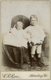 Keywords: photo border monochrome Brother and sister are seen posing together for a picture. Mary Anderson Gilliam, 14 months, and Charlie Macalister Gilliam, Jr. 3 years, 10 months. Back is inscribed, “For Dear Mrs. _____ with much love- Charlie Macalister Gilliam, Jr. Age 3 yrs. + 10 mos. Mary Anderson Gilliam age 14 months September ‘97” C.R. Rees Photo Studio; Petersburg, Va. Ca. September 1897 (Cabinet Card, 4”x6.5”). From the R. Beverly R. Webb Photograph Collection ca. 1880-1900, PhC.19, State Archives of North Carolina, Raleigh, NC. Brother and sister are seen posing together for a picture. Mary Anderson Gilliam, 14 months, and Charlie Macalister Gilliam, Jr. 3 years, 10 months. Back is inscribed, “For Dear Mrs. _____ with much love- Charlie Macalister Gilliam, Jr. Age 3 yrs. + 10 mos. Mary Anderson Gilliam age 14 months September ‘97” C.R. Rees Photo Studio; Petersburg, Va. Ca. September 1897 (Cabinet Card, 4”x6.5”). From the R. Beverly R. Webb Photograph Collection ca. 1880-1900, PhC.19, State Archives of North Carolina, Raleigh, NC. |