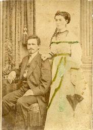 Keywords: Photograph of Samuel David Dunavant (7 November 1839 – 14 January 1906) and his wife Mary Virginia Corpening Dunavant (6 November 1846 – 30 January 1891). Photo is believed to have been taken on or around the occasion of their wedding in 1869. Card photograph, slightly colorized with green tint on Virginia’s dress and red tint in hair ornament. Original card photograph bears insignia of C. Campbell’s Photographic Gallery, 9th and Main Streets, Richmond, VA, on the back; original was once larger but borders on all sides have been cut in order to fit the photograph into the small frame in which it was donated (frame has since been removed). Samuel Dunavant served the Confederacy during the Civil War, first in Co. E, 6th Regiment NC Troops and later after being wounded at Fredericksburg and Seven Pines, VA, in Co. K, 4th Regiment VA Cavalry. After the end of the war he settled in Morganton, NC, and became a very prolific and successful railroad contractor, completing many projects in western NC, throughout the South, and in Jamaica. His projects developed many western NC cities and towns, and included a large contract for the South & Western Railroad, predecessor of the Clinchfield Railroad - the last Class I railroad built in the eastern United States. In addition to his work building railroads he was also a highly successful entrepreneur owning and operating several businesses in Morganton including a livery stable, brick manufacturing concern, the Eagle Hotel, and the Dunavant Cotton Manufacturing Company (later Alpine Cotton Mill). A detailed biography and history of Dunavant’s work and extended family has been written by donor Chris Robertson, a Dunavant decendant. Titled Railroad Builders: The Dunavant Family of Virginia, North Carolina and Tennessee, a copy of it is included with the collection and is also freely available here – www.lulu.com/shop/http:/www.lulu.com/shop/c-h-robertson-m... Photograph of Samuel David Dunavant (7 November 1839 – 14 January 1906) and his wife Mary Virginia Corpening Dunavant (6 November 1846 – 30 January 1891). Photo is believed to have been taken on or around the occasion of their wedding in 1869. Card photograph, slightly colorized with green tint on Virginia’s dress and red tint in hair ornament. Original card photograph bears insignia of C. Campbell’s Photographic Gallery, 9th and Main Streets, Richmond, VA, on the back; original was once larger but borders on all sides have been cut in order to fit the photograph into the small frame in which it was donated (frame has since been removed). Samuel Dunavant served the Confederacy during the Civil War, first in Co. E, 6th Regiment NC Troops and later after being wounded at Fredericksburg and Seven Pines, VA, in Co. K, 4th Regiment VA Cavalry. After the end of the war he settled in Morganton, NC, and became a very prolific and successful railroad contractor, completing many projects in western NC, throughout the South, and in Jamaica. His projects developed many western NC cities and towns, and included a large contract for the South & Western Railroad, predecessor of the Clinchfield Railroad - the last Class I railroad built in the eastern United States. In addition to his work building railroads he was also a highly successful entrepreneur owning and operating several businesses in Morganton including a livery stable, brick manufacturing concern, the Eagle Hotel, and the Dunavant Cotton Manufacturing Company (later Alpine Cotton Mill). A detailed biography and history of Dunavant’s work and extended family has been written by donor Chris Robertson, a Dunavant decendant. Titled Railroad Builders: The Dunavant Family of Virginia, North Carolina and Tennessee, a copy of it is included with the collection and is also freely available here – www.lulu.com/shop/http:/www.lulu.com/shop/c-h-robertson-m... |