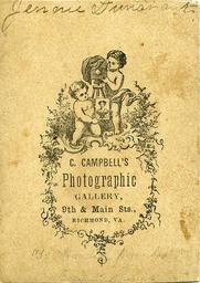 Keywords: text writing texture drawing Back of a photograph of Samuel David Dunavant (7 November 1839 – 14 January 1906) and his wife Mary Virginia Corpening Dunavant (6 November 1846 – 30 January 1891). Photo is believed to have been taken on or around the occasion of their wedding in 1869. Card photograph, slightly colorized with green tint on Virginia’s dress and red tint in hair ornament. Original card photograph bears insignia of C. Campbell’s Photographic Gallery, 9th and Main Streets, Richmond, VA, on the back; original was once larger but borders on all sides have been cut in order to fit the photograph into the small frame in which it was donated (frame has since been removed). Samuel Dunavant served the Confederacy during the Civil War, first in Co. E, 6th Regiment NC Troops and later after being wounded at Fredericksburg and Seven Pines, VA, in Co. K, 4th Regiment VA Cavalry. After the end of the war he settled in Morganton, NC, and became a very prolific and successful railroad contractor, completing many projects in western NC, throughout the South, and in Jamaica. His projects developed many western NC cities and towns, and included a large contract for the South & Western Railroad, predecessor of the Clinchfield Railroad - the last Class I railroad built in the eastern United States. In addition to his work building railroads he was also a highly successful entrepreneur owning and operating several businesses in Morganton including a livery stable, brick manufacturing concern, the Eagle Hotel, and the Dunavant Cotton Manufacturing Company (later Alpine Cotton Mill). A detailed biography and history of Dunavant’s work and extended family has been written by donor Chris Robertson, a Dunavant decendant. Titled Railroad Builders: The Dunavant Family of Virginia, North Carolina and Tennessee, a copy of it is included with the collection and is also freely available here – www.lulu.com/shop/http:/www.lulu.com/shop/c-h-robertson-m... Back of a photograph of Samuel David Dunavant (7 November 1839 – 14 January 1906) and his wife Mary Virginia Corpening Dunavant (6 November 1846 – 30 January 1891). Photo is believed to have been taken on or around the occasion of their wedding in 1869. Card photograph, slightly colorized with green tint on Virginia’s dress and red tint in hair ornament. Original card photograph bears insignia of C. Campbell’s Photographic Gallery, 9th and Main Streets, Richmond, VA, on the back; original was once larger but borders on all sides have been cut in order to fit the photograph into the small frame in which it was donated (frame has since been removed). Samuel Dunavant served the Confederacy during the Civil War, first in Co. E, 6th Regiment NC Troops and later after being wounded at Fredericksburg and Seven Pines, VA, in Co. K, 4th Regiment VA Cavalry. After the end of the war he settled in Morganton, NC, and became a very prolific and successful railroad contractor, completing many projects in western NC, throughout the South, and in Jamaica. His projects developed many western NC cities and towns, and included a large contract for the South & Western Railroad, predecessor of the Clinchfield Railroad - the last Class I railroad built in the eastern United States. In addition to his work building railroads he was also a highly successful entrepreneur owning and operating several businesses in Morganton including a livery stable, brick manufacturing concern, the Eagle Hotel, and the Dunavant Cotton Manufacturing Company (later Alpine Cotton Mill). A detailed biography and history of Dunavant’s work and extended family has been written by donor Chris Robertson, a Dunavant decendant. Titled Railroad Builders: The Dunavant Family of Virginia, North Carolina and Tennessee, a copy of it is included with the collection and is also freely available here – www.lulu.com/shop/http:/www.lulu.com/shop/c-h-robertson-m... |
