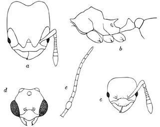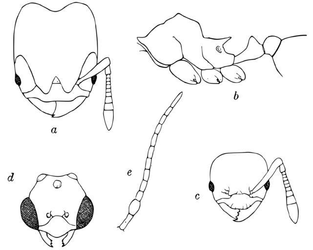 Keywords: Pheidole.mendicula.-.wheeler.svg Pheidole mendicula a head of soldier dorsal aspect; b thorax and pedicel of same in profile; c head of worker dorsal aspect; d head of male; e antenna of same A new guest-ant and other new Formicidae from Barro Colorado Island Panama Biological Bulletin 49 150-181 http //research amnh org/entomology/social_insects/ants/publications/3382/3382 pdf PDF 1925 W M Wheeler pd-old PD-old Drawings of animals by William Morton Wheeler Drawings of ants Pheidole mendicula Pheidole heads Pheidole anatomy |