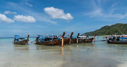 Keywords: phi phi island tour phuket thailand wooden boats beach sea water tourism nature mountains rocks landscape travel summer holiday sky ocean outdoor tropical scenery clouds sunny