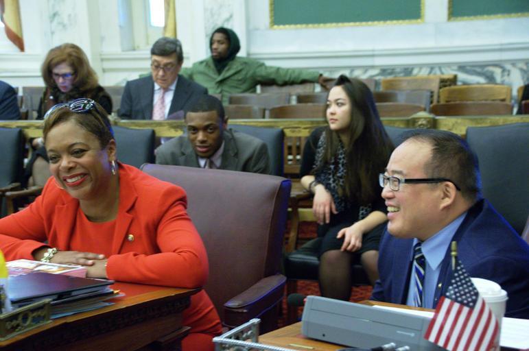 | Keywords: philadelphia city council philadelphiacitycouncil philadelphia cindy bass cindybass david oh davidoh people Photos from the Stated Meeting of Philadelphia City Council held on Thursday, December 10, 2015, the final Council meeting of this term. On the agenda, bills including: a cable franchise renewal with Comcast, two zoning bills regarding a South Philly casino/hotel, a vehicle registration fee designed to fund street calming efforts. Also, a visit from outgoing Philadelphia Mayor Michael A. Nutter, farewells to the three Council Members departing after this term: Marian Tasco (9th District), Wilson Goode, Jr. and Dennis O'Brien (At Large). Photos by Samar Jha/PHL Council Fellow. Photos from the Stated Meeting of Philadelphia City Council held on Thursday, December 10, 2015, the final Council meeting of this term. On the agenda, bills including: a cable franchise renewal with Comcast, two zoning bills regarding a South Philly casino/hotel, a vehicle registration fee designed to fund street calming efforts. Also, a visit from outgoing Philadelphia Mayor Michael A. Nutter, farewells to the three Council Members departing after this term: Marian Tasco (9th District), Wilson Goode, Jr. and Dennis O'Brien (At Large). Photos by Samar Jha/PHL Council Fellow. |