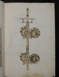 | Keywords: Philipp Mönch - Kriegsbuch - cod. pal. germ. 126 - 029.jpg Philipp Mönch - Kriegsbuch - cod pal germ 126 - jpg 028 030 de ;Kriegsbuch Dys büch der stryt vnd bůchßen Ward gemacht in der Vaßnacht als man zalt von cristus geburt 1496 11 -16 Februar 1496 jar dar uff soellen die buchßenmeister haben groß acht fer war Zweiachsiges Fahrgestell mit eisenbeschlagenen Rädern und beweglicher Deichsel Langbaum mit rückwärts angeschiffteten Gabelenden und darauf eine Zugwaage zum Einspannen der Zugtiere Philipp Mönch Kriegsbuch Papier 44 Bl 41x28 5 cm Heidelberg 1496 Cod Pal germ 126 Universtiätsbibliothek Heidelberg http //digi ub uni-heidelberg de/diglit/cpg126 1496 Philipp Mönch PD-old-100 Kriegsbuch Cod Pal germ 126 |