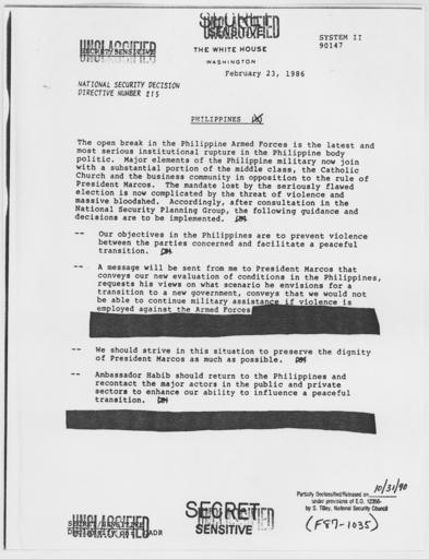 | Keywords: Philippines - NARA - 198326.jpg Scope and content General notes 198326 Local identifier President 1981-1989 Reagan National Security Council 1981 - 1989 Ronald Reagan Library NLRR 40 Presidential Drive Simi Valley CA 93065-0600 1986-02-23 Record group Collection RR-NSC Numbered National Security Policy Papers 1981 - 1989 Record group ARC 1189 National Security Decision Directives compiled 02/25/1981 - 01/19/1989 Series ARC 198166 File unit File unit ARC Variant control numbers NAIL Control Number NLS-NSC-NSDD-215 Other versions <gallery> File Philippines_-_NARA_-_198326 tif tif File Philippines_-_NARA_-_198326 jpg jpg </gallery> NARA-cooperation PD-USGov Presidential Decision Directives Reagan |