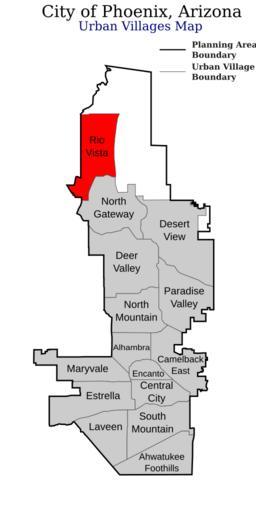 | Keywords: Phoenix Urban Villages Rio Vista highlighted.svg This map shows the Urban Villages within the City of Phoenix ” Maricopa County Arizona Rio Vista is highlighted in red It is one of the newest Urban Villages established in 2004 ;Credits I created it in Inkscape using data from the City of Phoenix Website specifically the http //phoenix gov/PLANNING/vplanners pdf Urban Village Planners Map My own work based on government information Though I strove to be as accurate in the detail as possible the information isn't one hundred percent accurate 2008-04-15 Ixnayonthetimmay Public Domain See Category Maps of the Urban Villages of Phoenix Arizona for other versions of this image Maps of the Urban Villages of Phoenix Arizona Created with Inkscape |
