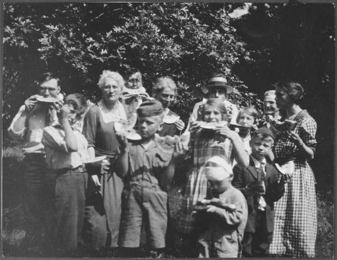 | Keywords: Photograph of Gerald R. Ford, Jr., His Half-Brother Tom, and Other Relatives Eating Watermelon at a Gathering in Oak... - NARA - 186956.tif Scope and content This photograph depicts James Eliker Gardner Gardie James Mrs Noble an unidentified man Gerald R Jerry Ford Jr Mrs Galaty Peter C Galaty Adele James Tom Ford Helen Galaty James Galaty Grandma James and Beula Tata Eliker standing with many of the people eating watermelon Gerald Ford is wearing overalls and a cap and his half-brother Tom's head is wrapped in a bandage Adele and Gardner James are Gerald Ford's maternal cousins The site is likely 410 N Humphrey Street Oak Park Illinois at the residence of Clarence and Tannisse James brother-in-law and sister of Dorothy Gardner Ford Gerald Ford's mother General notes 186956 Local identifier GRF-WHPO-H0030 01 President 1974-1977 Ford White House Photographic Office 1974 - 1977 Gerald R Ford Presidential Library http //www fordlibrarymuseum gov/avproj/hseries/1920 asp H0030-1 Institution Gerald R Ford Presidential Library Gerald R Ford Library NLGRF 1000 Beal Avenue Ann Arbor MI 48109-2114 1922 Record group Collection GRF-WHPO White House Photographic Office Collection Ford Administration 12/06/1973 - 01/20/1977 Record group ARC 1136 Gerald and Betty Ford Historical Photographs compiled 08/09/1974 - 01/20/1977 documenting the period 1884 - 1974 Series ARC 186757 File unit File unit ARC Variant control numbers NAIL Control Number NLF-WHPO-A-H0030 01 yes Other versions Gerald R Ford Presidential Library and Museum-cooperation PD-USGov Gerald Ford before 1974 Family of Gerald Ford People eating watermelons Gerald R Ford Presidential Library and Museum series Gerald and Betty Ford Historical Photographs compiled 08/09/1974 - 01/20/1977 documenting the period 1884 - 1974 |
