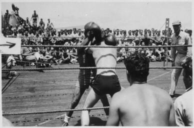 Keywords: Photograph of Gerald R. Ford, Jr., Watching a Boxing Match on the Flight Deck of the U.S.S. Monterey - NARA - 187032.tif Scope and content This photograph depicts Gerald R Ford seated on far left with boxers and a referee in the foreground The ship's crew is visible in the background The photograph was taken aboard the United States Naval Aircraft Carrier U S S Monterey on which Lieutenant Commander Ford served as Athletic Director An arrow points to Ford on the photo General notes 187032 Local identifier GRF-WHPO-H0059 04 President 1974-1977 Ford White House Photographic Office 1974 - 1977 Gerald R Ford Presidential Library http //www fordlibrarymuseum gov/avproj/hseries/ww2 asp H0059-4 Institution Gerald R Ford Presidential Library Gerald R Ford Library NLGRF 1000 Beal Avenue Ann Arbor MI 48109-2114 1944 Record group Collection GRF-WHPO White House Photographic Office Collection Ford Administration 12/06/1973 - 01/20/1977 Record group ARC 1136 Gerald and Betty Ford Historical Photographs compiled 08/09/1974 - 01/20/1977 documenting the period 1884 - 1974 Series ARC 186757 File unit File unit ARC Variant control numbers NAIL Control Number NLF-WHPO-A-H0059 04 yes Other versions Gerald R Ford Presidential Library and Museum-cooperation PD-USGov USS Monterey CVL-26 Gerald Ford before 1974 Black and white photographs Boxing in the United States Sports in the United States Navy Gerald R Ford Presidential Library and Museum series Gerald and Betty Ford Historical Photographs compiled 08/09/1974 - 01/20/1977 documenting the period 1884 - 1974 |