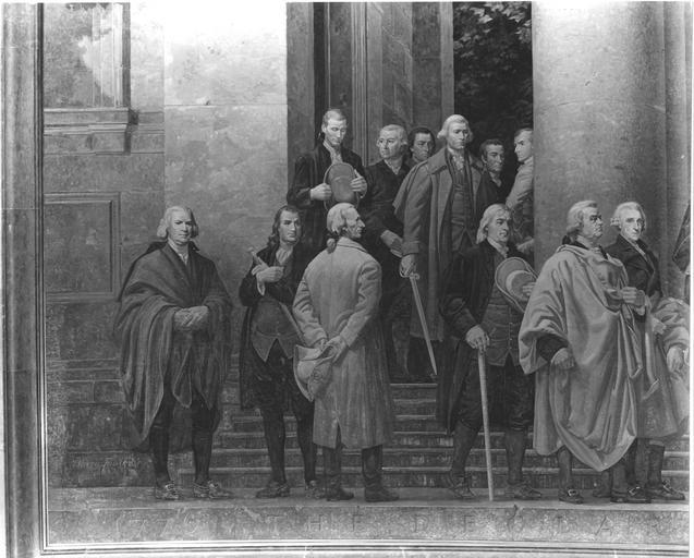 Keywords: nara:arcid=7820681 u.s. national archives usnationalarchives national archives building nationalarchivesbuilding blackandwhite monochrome surreal outdoor photo border black and white Original Caption: Photograph of the Left Section of the Mural, The Declaration of Independence, by Barry Faulkner, 10/27/1936 U.S. National Archives’ Local Identifier: 64-NA-116 Scope and Content Note:In this detail of the Barry Faulkner mural, The Declaration of Independence, the figures pictured from left to right in the front row are: Robert Morris, Samuel Chase, Charles Carroll, Stephen, Hopkins, Samuel Adams, and Thomas McKean. Pictured left to right back row: Joseph Hewes, Edward Rutledge, Lyman Hall, Josiah Bartlett, Thomas Stone, and Francis Hopkinson. From: Series : Historic Photograph File of National Archives Events and Personnel, compiled 1935 - 1975, documenting the period ca. 1928 - 1975 Created By: General Services Administration. National Archives and Records Service. Office of Educational Programs. Education Division. (? - 04/01/1985) Production Date: 10/27/1936 Persistent URL: research.archives.gov/description/7820681 Repository: National Archives at College Park - Still Pictures (RD-DC-S), National Archives at College Park For information about ordering reproductions of photographs held by the Still Picture Unit, visit: www.archives.gov/research/order/still-pictures.html Reproductions may be ordered via an independent vendor. NARA maintains a list of vendors at www.archives.gov/research/order/vendors-photos-maps-dc.html Original Caption: Photograph of the Left Section of the Mural, The Declaration of Independence, by Barry Faulkner, 10/27/1936 U.S. National Archives’ Local Identifier: 64-NA-116 Scope and Content Note:In this detail of the Barry Faulkner mural, The Declaration of Independence, the figures pictured from left to right in the front row are: Robert Morris, Samuel Chase, Charles Carroll, Stephen, Hopkins, Samuel Adams, and Thomas McKean. Pictured left to right back row: Joseph Hewes, Edward Rutledge, Lyman Hall, Josiah Bartlett, Thomas Stone, and Francis Hopkinson. From: Series : Historic Photograph File of National Archives Events and Personnel, compiled 1935 - 1975, documenting the period ca. 1928 - 1975 Created By: General Services Administration. National Archives and Records Service. Office of Educational Programs. Education Division. (? - 04/01/1985) Production Date: 10/27/1936 Persistent URL: research.archives.gov/description/7820681 Repository: National Archives at College Park - Still Pictures (RD-DC-S), National Archives at College Park For information about ordering reproductions of photographs held by the Still Picture Unit, visit: www.archives.gov/research/order/still-pictures.html Reproductions may be ordered via an independent vendor. NARA maintains a list of vendors at www.archives.gov/research/order/vendors-photos-maps-dc.html |