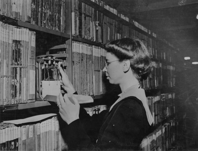 bw woman records glasses library profile 1942 shelves humidity preservation stacks minogue archivist usnationalarchives unitedstatesnationalarchivespersonnel nara:arcid=3493247 |