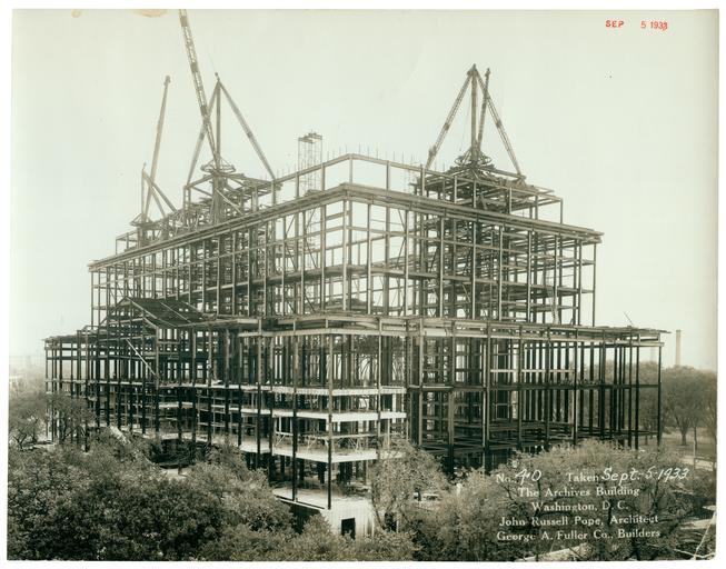 | Keywords: u.s. national archives usnationalarchives nara:arcid=7368460 nara archives building construction 1933 09/05/1933 09051933 john russell pope johnrussellpope george a. fuller co. georgeafullerco washington d.c. washingtondc crane national archives building nationalarchivesbuilding outdoor photo border Original Caption: Photograph of the National Archives Building Being Constructed, 08/01/1933 U.S. National Archives’ Local Identifier: 121-BCP-111B-40 From: Construction of Federal Buildings, compiled 1885 - 1954 Created By: General Services Administration. Public Buildings Service.(12/11/1949 - ) Production Date: 09/05/1933 Persistent URL: research.archives.gov/description/7368460 Repository: National Archives at College Park - Still Pictures (RD-DC-S) For information about ordering reproductions of photographs held by the Still Picture Unit, visit: www.archives.gov/research/order/still-pictures.html Reproductions may be ordered via an independent vendor. NARA maintains a list of vendors at www.archives.gov/research/order/vendors-photos-maps-dc.html Original Caption: Photograph of the National Archives Building Being Constructed, 08/01/1933 U.S. National Archives’ Local Identifier: 121-BCP-111B-40 From: Construction of Federal Buildings, compiled 1885 - 1954 Created By: General Services Administration. Public Buildings Service.(12/11/1949 - ) Production Date: 09/05/1933 Persistent URL: research.archives.gov/description/7368460 Repository: National Archives at College Park - Still Pictures (RD-DC-S) For information about ordering reproductions of photographs held by the Still Picture Unit, visit: www.archives.gov/research/order/still-pictures.html Reproductions may be ordered via an independent vendor. NARA maintains a list of vendors at www.archives.gov/research/order/vendors-photos-maps-dc.html |