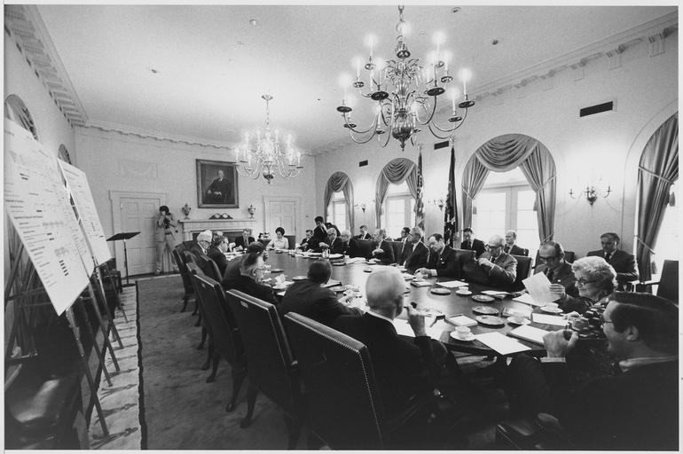 | Keywords: Photograph of President Gerald R. Ford Participating in a Meeting with his Cabinet in the Cabinet Room - NARA - 186782.tif This photograph depicts Cabinet members seated around the table clockwise from President Ford James R Schlesinger Secretary of Defense; Frederick B Dent Secretary of Commerce; Claude S Brinegar Secretary of Transportation; Dean Burch Counsellor to the President; Mary Louise Smith Chairman of the Republican National Committee; Donald H Rumsfeld Assistant to the President; Frank C Carlucci Secretary of Housing and Urban Development; James T Lynn Secretary of Housing and Urban Development; Earl L Butz Secretary of Agriculture; Stephen S Gardner Deputy Secretary of the Treasury; Laurence H Silberman Deputy Attorney General; Peter J Brennan Secretary of Labor; Roy L Ash Director of the Office of Management and Budget; John O Marsh Counsellor to the President; Robert T Hartmann Counsellor to the President; Anne Armstrong Counsellor; unidentified; Rogers C B Morton Secretary of the Interior; Robert S Ingersoll Deputy Secretary of State In rear left to right Russell E Train Administrator of the Environmental Protection Agency; L William Siedman Executive Director of the Economic Policy Board; William J Baroody Jr Assistant to the President for Public Liaison; Alan Greenspan Chairman of the Council of Economic Adviser; Brent Scowcroft Deputy Assistant for National Security Affairs; and John W Barnum Under Secretary of Transportation General notes 186782 Local identifier GRF-WHPO-A1683 8 President 1974-1977 Ford White House Photographic Office 1974 - 1977 Kennerly David Hume 1947- Photographer 1312484 <br /> Institution Gerald R Ford Presidential Library Gerald R Ford Library NLGRF 1000 Beal Avenue Ann Arbor MI 48109-2114 1974-10-30 Record group Collection GRF-WHPO White House Photographic Office Collection Ford Administration 12/06/1973 - 01/20/1977 Record group ARC 1136 Gerald R Ford White House Photographs compiled 08/09/1974 - 01/20/1977 Series ARC 1756311 File unit File unit ARC Variant control numbers NAIL Control Number NLF-WHPO-A-A1683 8 yes Other versions Gerald R Ford Presidential Library and Museum-cooperation PD-USGov Gerald Ford in 1974 Cabinet Room Rogers Morton Frederick B Dent Claude Brinegar James R Schlesinger Donald Rumsfeld Frank Carlucci James Thomas Lynn Earl Butz Peter J Brennan Roy Ash Russell E Train Gerald R Ford Presidential Library and Museum series Gerald R Ford White House Photographs compiled 08/09/1974 - 01/20/1977 |