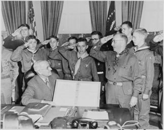 Keywords: Photograph of President Truman in the Oval Office receiving a report on the accomplishments of the Boy Scouts from a... - NARA - 200293.jpg Scope and content General notes 200293 Local identifier National Archives and Records Administration Office of Presidential Libraries Harry S Truman Library 04/01/1985 - NARA-Author Rowe Abbie 1905-1967 Photographer 8451352 <br /> Harry S Truman Library NLHST 500 West U S Highway 24 Independence MO 64050-1798 1951-02-06 Record group Collection HST-AVC Audiovisual Collection 1957 - 2006 Record group ARC 1207 Photographs Relating to the Administration Family and Personal Life of Harry S Truman compiled 1957 - 2004 documenting the period 1849 - 2004 Series ARC 198606 File unit File unit ARC Variant control numbers NAIL Control Number NLT-AVC-PHT- 73 3609 Other versions <gallery> File Photograph_of_President_Truman_in_the_Oval_Office_receiving_a_report_on_the_accomplishments_of_the_Boy_Scouts_from_a _-_NARA_-_200293 tif tif File Photograph_of_President_Truman_in_the_Oval_Office_receiving_a_report_on_the_accomplishments_of_the_Boy_Scouts_from_a _-_NARA_-_200293 jpg jpg </gallery> NARA-cooperation PD-USGov DEFAULTSORT 19510206 Photographs by Abbie Rowe February 1951 in the United States Harry S Truman in 1951 White House in 1951 Boy Scouts of America Children in the Oval Office Harry S Truman in the Oval Office Scout salutes Scouting in Washington D C Black and white photographs of people Photographs taken on 1951-02-06 |