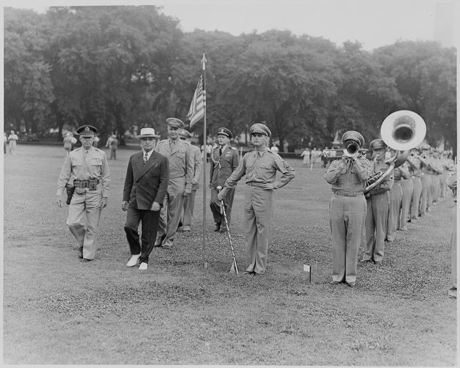 | Keywords: Photograph of President Truman walking past a military band that is playing on the Ellipse as he reviews the military... - NARA - 199382.tif Scope and content General notes 199382 Local identifier National Archives and Records Administration Office of Presidential Libraries Harry S Truman Library 04/01/1985 - NARA-Author Rowe Abbie 1905-1967 Photographer 8451352 <br /> Harry S Truman Library NLHST 500 West U S Highway 24 Independence MO 64050-1798 1946-07-09 Record group Collection HST-AVC Audiovisual Collection 1957 - 2006 Record group ARC 1207 Photographs Relating to the Administration Family and Personal Life of Harry S Truman compiled 1957 - 2004 documenting the period 1849 - 2004 Series ARC 198606 File unit File unit ARC Variant control numbers NAIL Control Number NLT-AVC-PHT-73 2227 yes Other versions <gallery> File Photograph_of_President_Truman_walking_past_a_military_band_that_is_playing_on_the_Ellipse_as_he_reviews_the_military _-_NARA_-_199382 tif tif File Photograph_of_President_Truman_walking_past_a_military_band_that_is_playing_on_the_Ellipse_as_he_reviews_the_military _-_NARA_-_199382 jpg jpg </gallery> NARA-cooperation PD-USGov Photographs by Abbie Rowe Black and white photographs NARA TIF images with categorized JPGs |