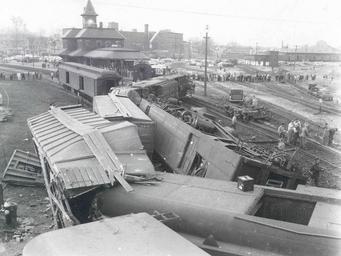 Keywords: smithsonian institution smithsonianinstitution derailed train derailedtrain new hampshire newhampshire upside down mailcar upsidedownmailcar wreck train black white old station train wreck boston & maine 302 trainwreckbostonmaine302 national postal museum nationalpostalmuseum outdoor Date: November 13, 1954 Object number: A.2009-49 Medium: paper; photo-emulsion Description: Wreckage of Boston & Maine train #302, the Red Wing, just outside the Nashua, New Hampshire train station. The train had been traveling at a high rate of speed and derailed on a curve entering the station. The locomotives derailed, hitting freight cars on an adjacent siding as they moved. A female passenger was killed, and 53 others injured in the wreck. Among the injured was one of the Railway Post Office clerks, who was pinned under tables and furnishings in the mail car. That car, visible in the center of the photograph, landed on its roof. National Postal Museum, Curatorial Photographic Collection Photographer: Unknown Place: United States of America      New Hampshire See more items in: National Postal Museum Collection Credit line: National Postal Museum, Curatorial Photographic Collection Photographer: Unknown Persistent URL:http://www.arago.si.edu/index.asp?con=2&cmd=1&id=207613 Repository:National Postal Museum View more collections from the Smithsonian Institution. Date: November 13, 1954 Object number: A.2009-49 Medium: paper; photo-emulsion Description: Wreckage of Boston & Maine train #302, the Red Wing, just outside the Nashua, New Hampshire train station. The train had been traveling at a high rate of speed and derailed on a curve entering the station. The locomotives derailed, hitting freight cars on an adjacent siding as they moved. A female passenger was killed, and 53 others injured in the wreck. Among the injured was one of the Railway Post Office clerks, who was pinned under tables and furnishings in the mail car. That car, visible in the center of the photograph, landed on its roof. National Postal Museum, Curatorial Photographic Collection Photographer: Unknown Place: United States of America New Hampshire See more items in: National Postal Museum Collection Credit line: National Postal Museum, Curatorial Photographic Collection Photographer: Unknown Persistent URL:http://www.arago.si.edu/index.asp?con=2&cmd=1&id=207613 Repository:National Postal Museum View more collections from the Smithsonian Institution. |