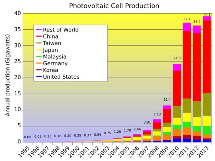 | Keywords: Photovoltaics cell production.svg translate yes en Photovoltaic cell manufacturing production from 1995-2013 Data source is http //www iea-pvps org/fileadmin/dam/public/report/statistics/IEA_PVPS_Trends_2014_in_PV_Applications_-_lr pdf IEA-PVPS pg 44 and http //www earth-policy org/datacenter/xls/indicator12_2013_2 xlsx Earth Policy Institute 2014-11-12 own Delphi234 other versions Largest Producers of Solar Cells by Country-Market Share svg current annually cc-zero Uploaded with UploadWizard Photovoltaic power statistics |